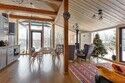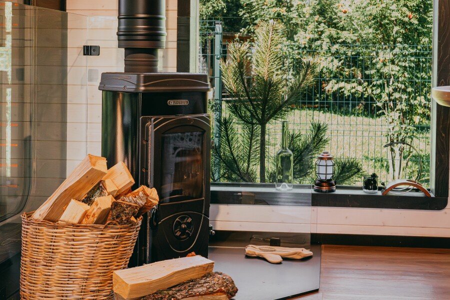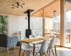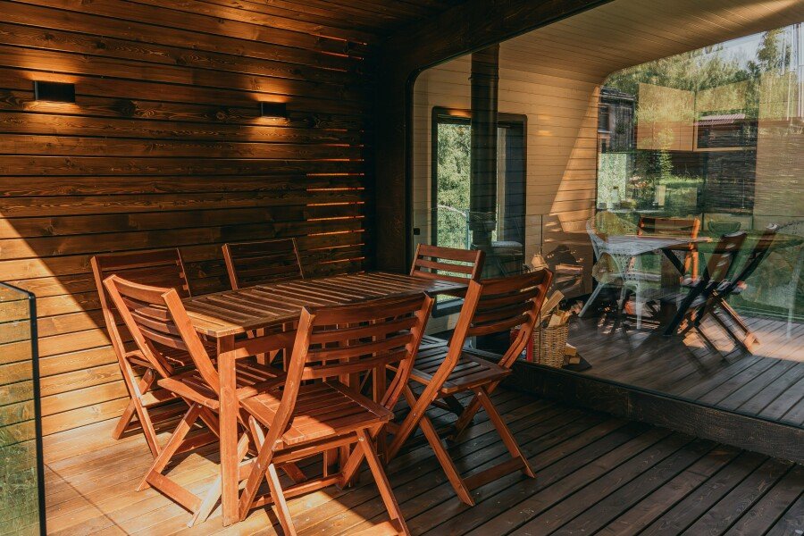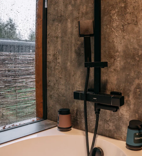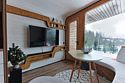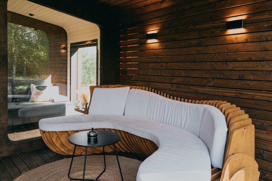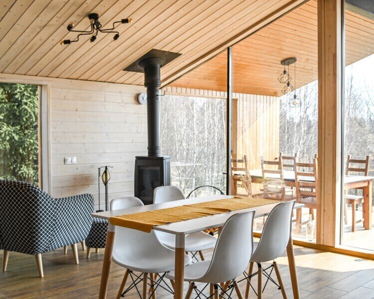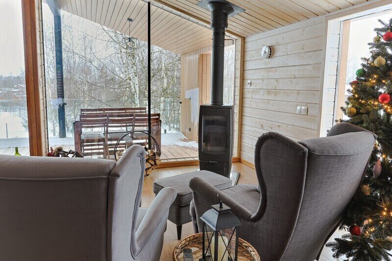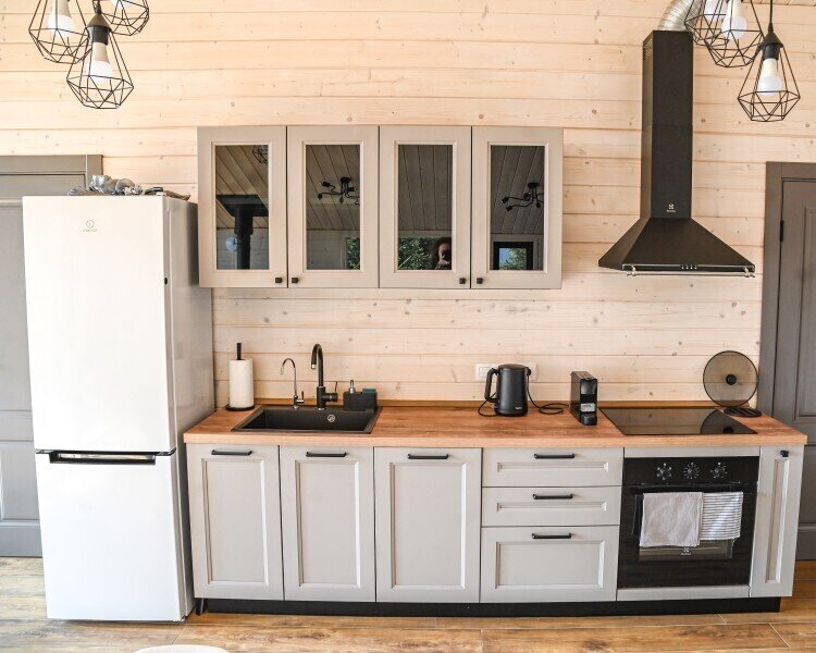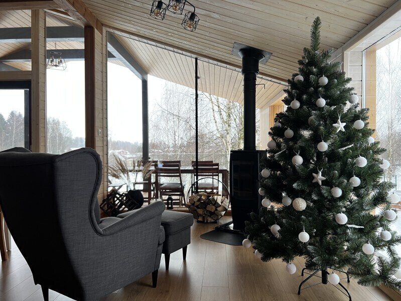 Коттеджи выполнены в элегантном стиле барнхаус, который сочетает в себе современность и экологичность. Панорамные окна позволяют любоваться живописными видами на природу, а теплые полы создают уют даже в прохладные вечера. В каждом домике есть просторная гостиная с телевизором и камином, современная кухня с индукционной плитой, посудомоечной машиной, духовкой, холодильником, чайником и кофемашиной. Интерьер домов оформлен стильно и удобно, что создает приятную атмосферу.