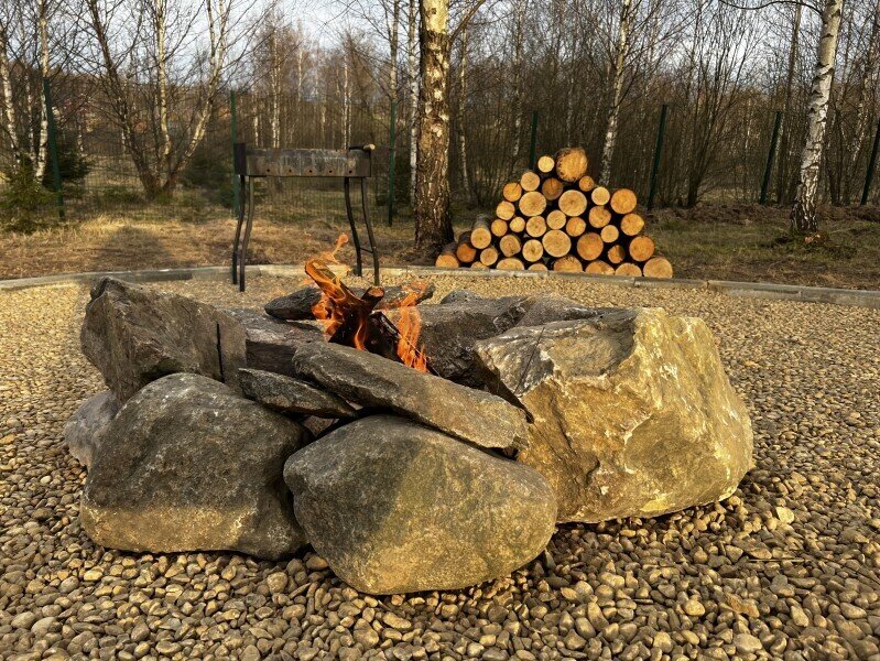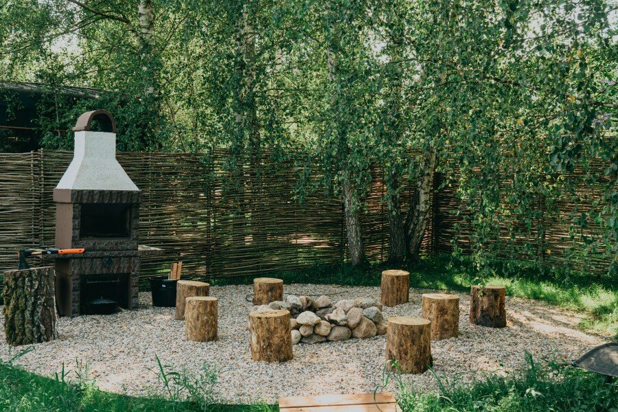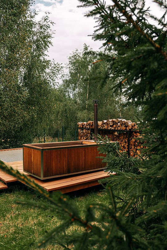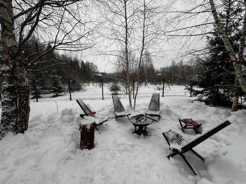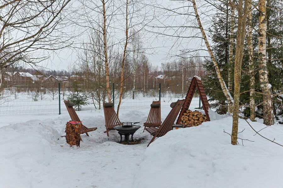 На участке: место для парковки автомобиля, мангал, патио с костровой чашей, дрова для костра и купели бесплатно, садовая мебель, купель Фурако с подогревом.