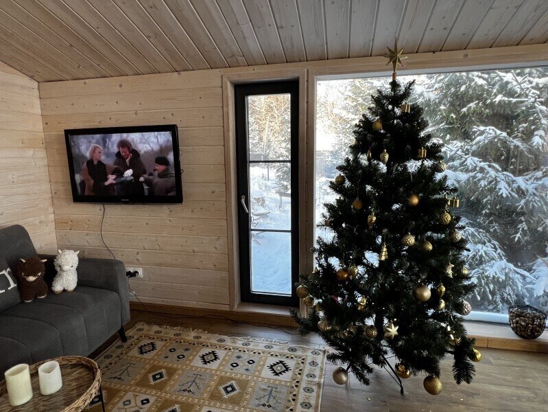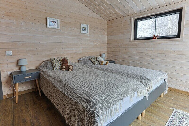 В доме: теплый пол, панорамное окно в спальне с видом на лес, ЖК‑телевизор со Smart TV, бризер, высокоскоростной интернет, Wi‑Fi, кондиционер, на кухне все необходимые приборы, посуда, чайник, печь, фильтр для воды и холодильник, шампуры и решетка для гриля, в санузле душ, комплект полотенец для каждого гостя и гигиенические принадлежности.