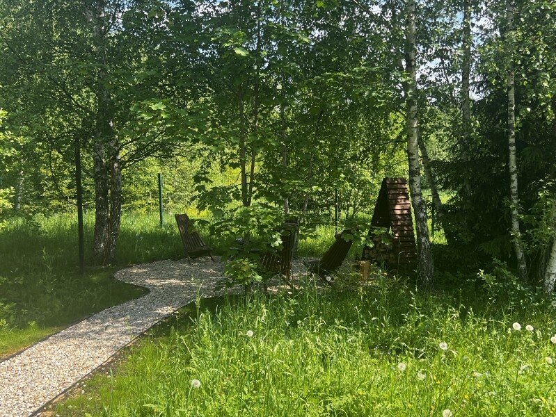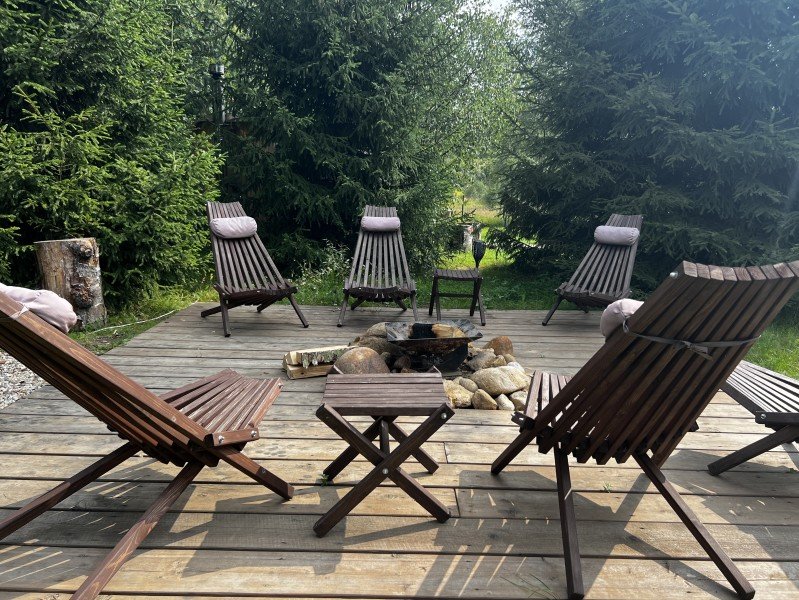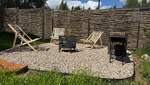 На участке: кострище и мангал для барбекю, шампуры и решетка для гриля, дрова для кострища предоставляются бесплатно, садовая мебель (кресла и шезлонги), бесплатная парковка для автомобиля на участке.