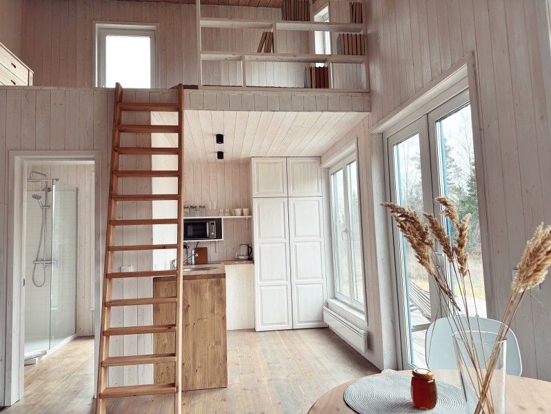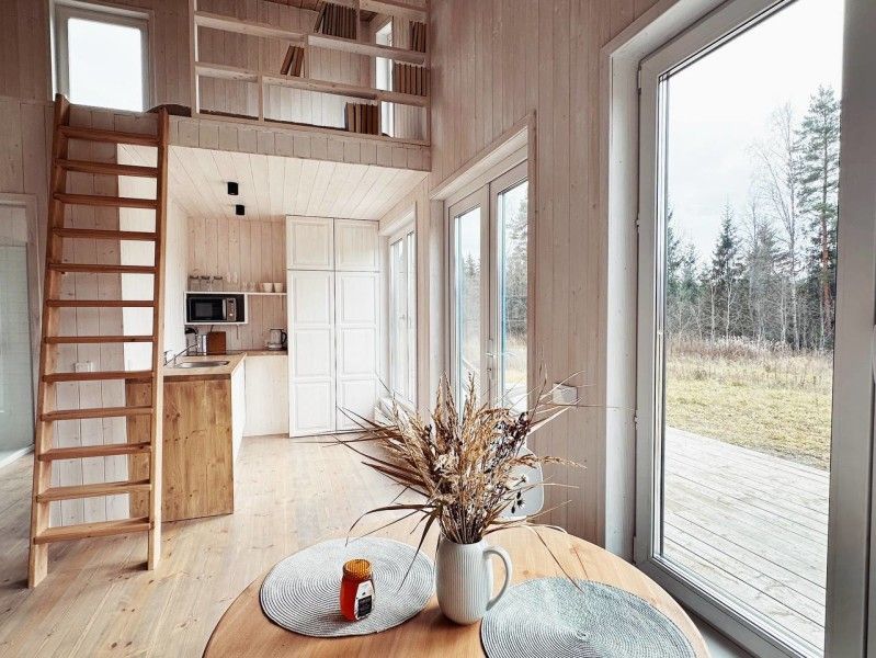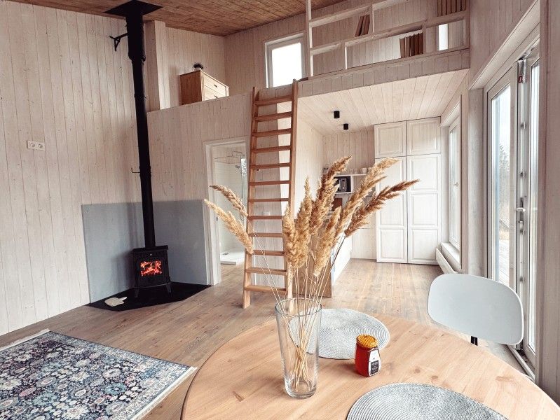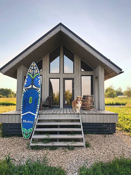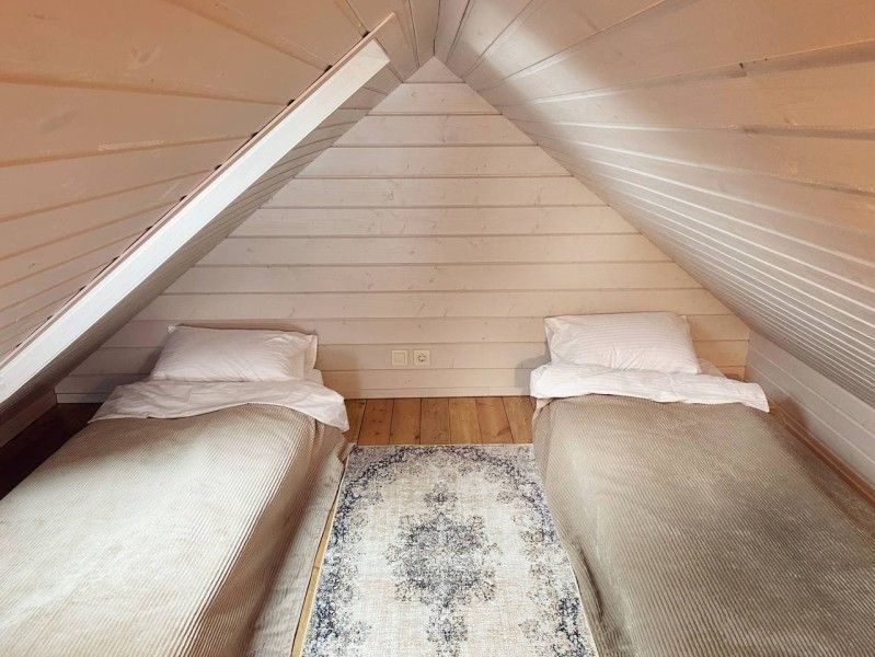 Дом с террасой и зоной барбекю. На первом этаже расположены: кухня-гостиная с раскладным диваном, камином, телевизором, высокоскоростным интернетом и полностью оборудованной кухней; совмещённый санузел с душем. На мансардном этаже располагается спальня с двуспальной кроватью.