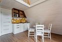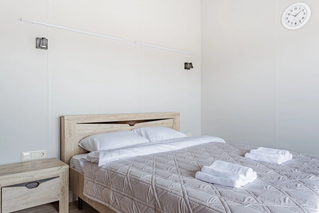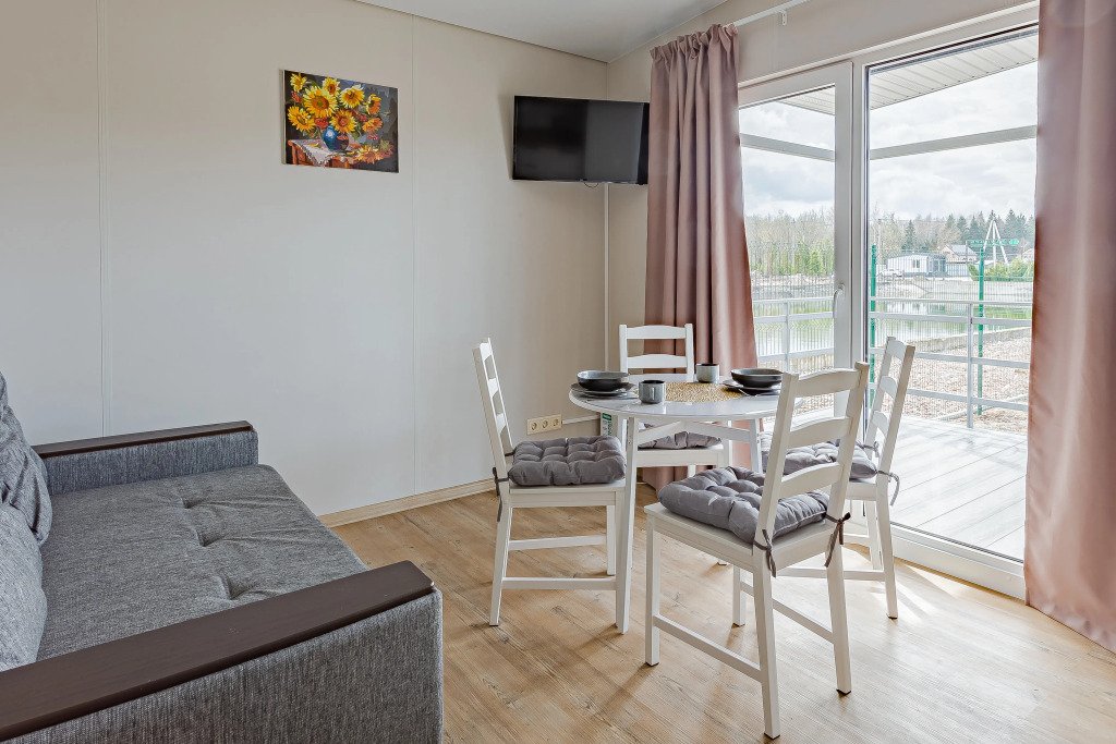 На территории базы отдыха находятся 12 уютных домиков шале и 6 стильных А-фрейм домиков. Каждый домик оборудован всем необходимым для комфортного проживания.