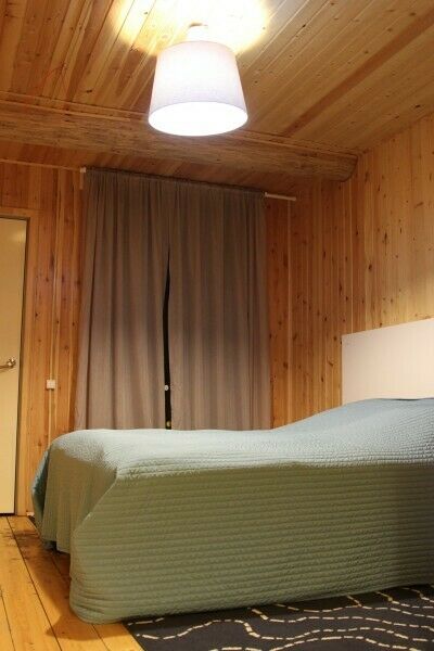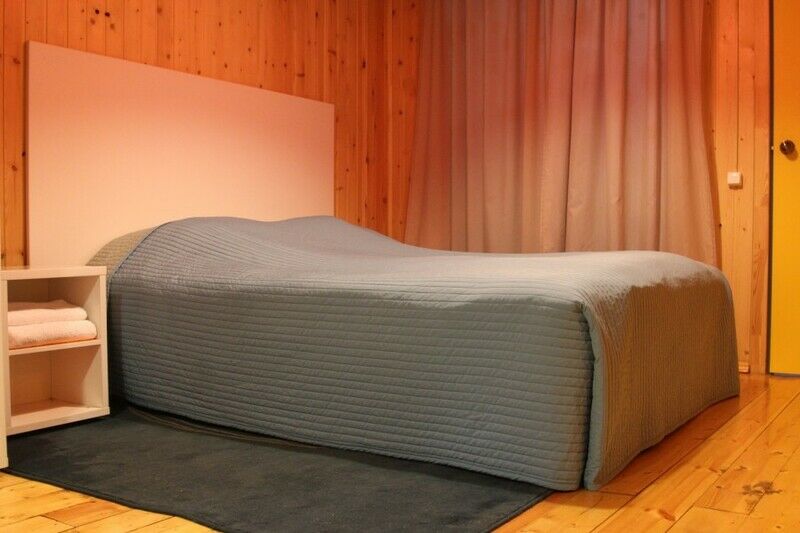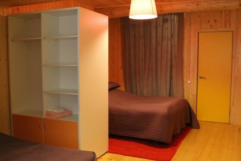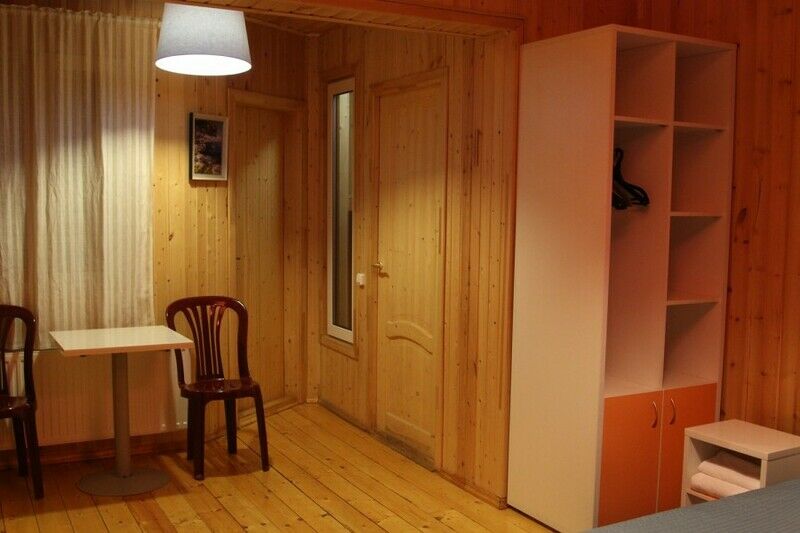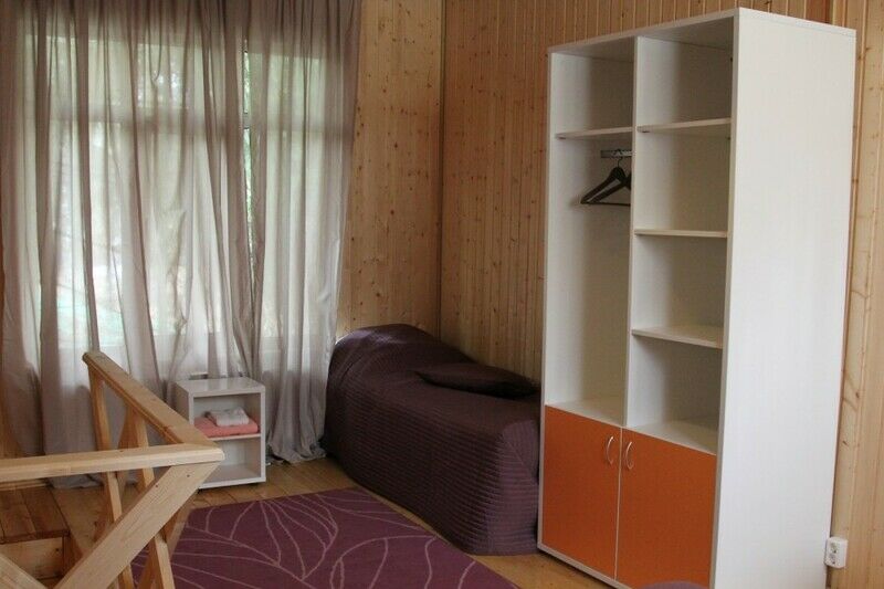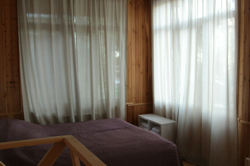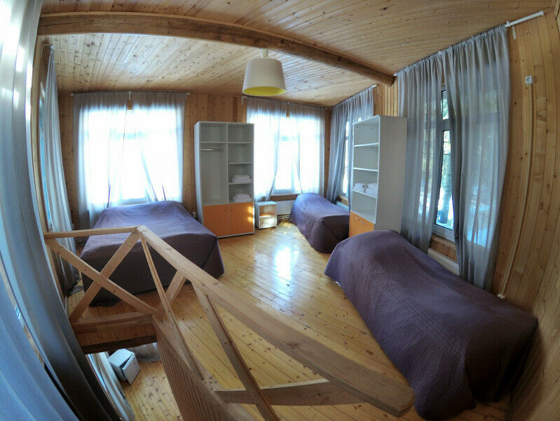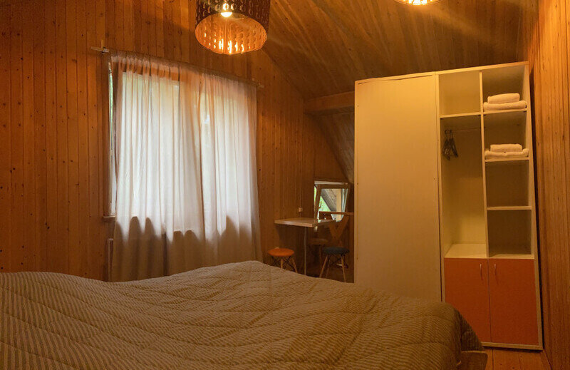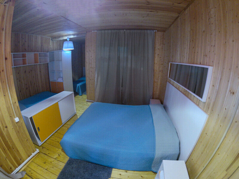 Двухуровневый домик, на первом этаже которого расположена зона отдыха, а также душ и туалет. На втором этаже спальня с одной двуспальной кроватью и двумя односпальными.
