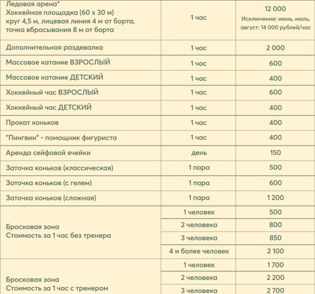 Работает школа с профессиональными тренерами для юных хоккеистов и фигуристов. Проводятся индивидуальные и групповые тренировки по хоккею и фигурному катанию. Стоимость: - индивидуальное занятие — 2500 ₽/час;
