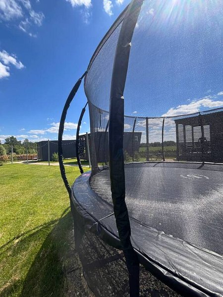 Гостей ждет уютный уголок для отдыха, где под мягкими тентами прячутся шезлонги, приглашая насладиться солнечными днями. Здесь можно не только сыграть партию в теннис, но и позволить детям весело прыгать на батуте, создавая незабываемые моменты для всей семьи на лоне природы.