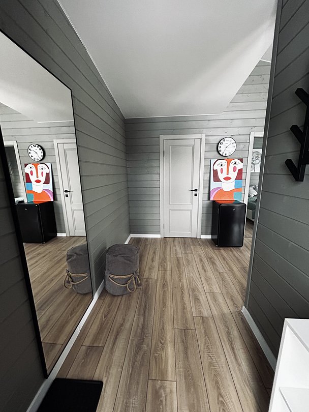 Внутри вас ждет уютная комната с двуспальной кроватью и прикроватными тумбочками. Большое панорамное окно открывает великолепный вид на поле, наполняя пространство светом и создавая атмосферу умиротворения. Для вашего комфорта предусмотрен кондиционер, который обеспечит приятную прохладу даже в самые жаркие дни.