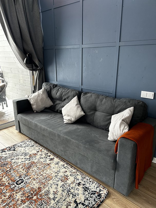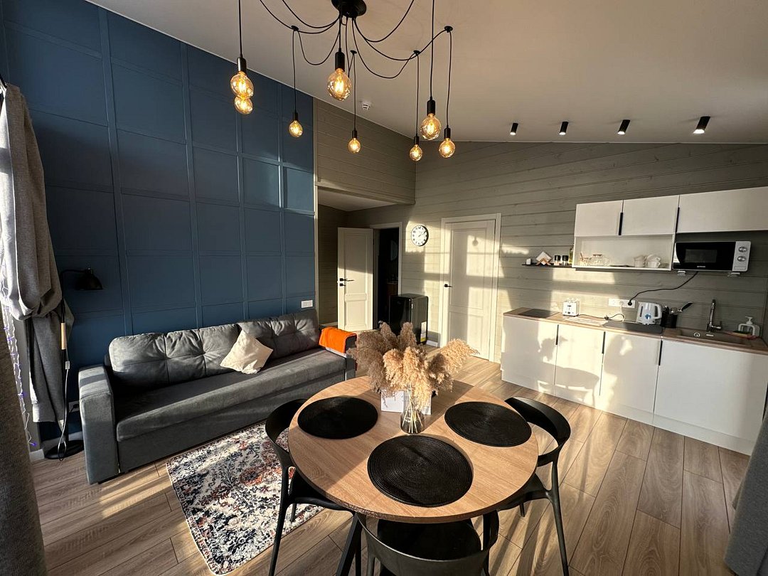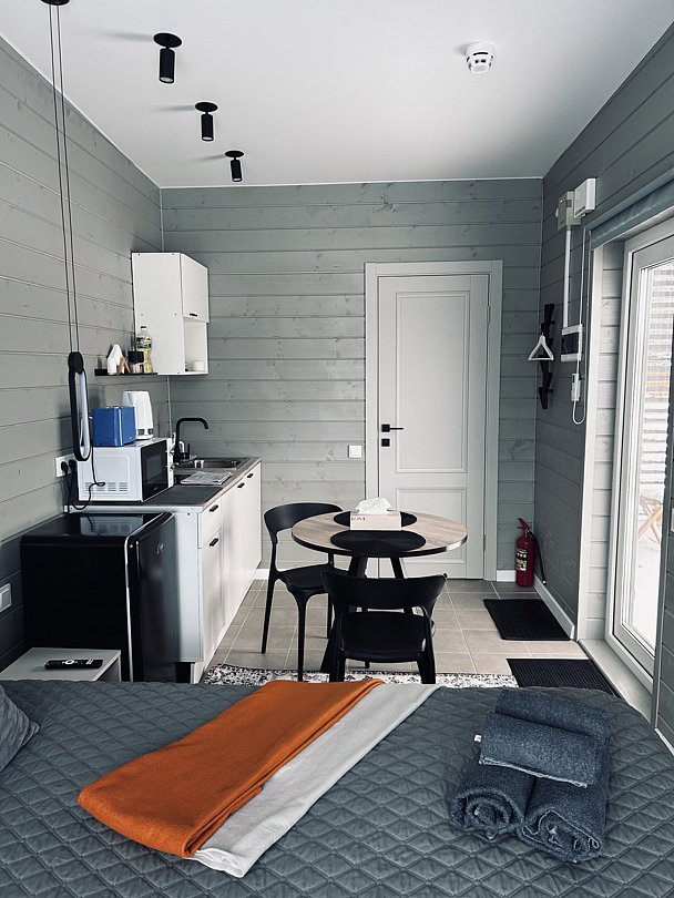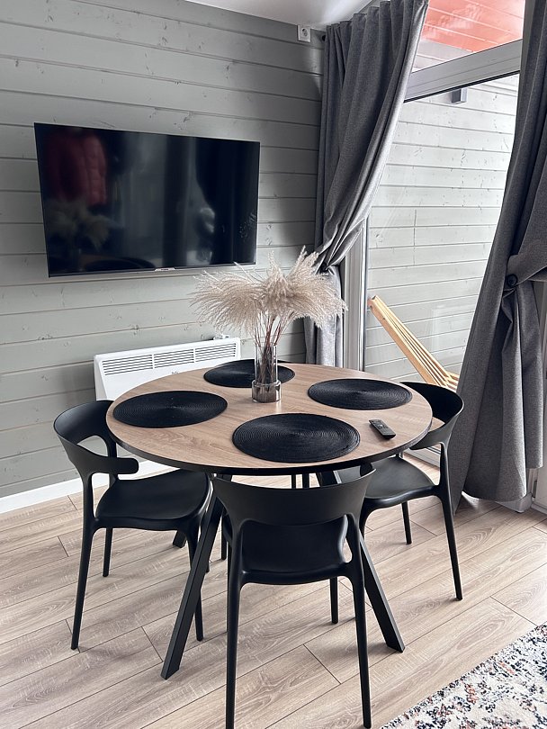 Внутри вас ждет светлая и просторная кухня-гостиная, где удобно разместится вся семья. Здесь есть раскладывающийся диван, телевизор для вечерних просмотров любимых фильмов и обеденный стол, за которым приятно собраться вместе. Кухня полностью оборудована: холодильник, тостер, чайник, микроволновка, а также вся необходимая посуда и приборы позволят вам готовить и наслаждаться домашними блюдами.