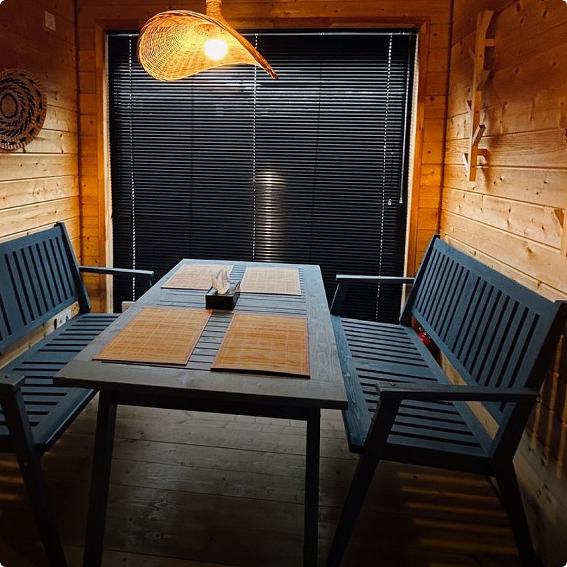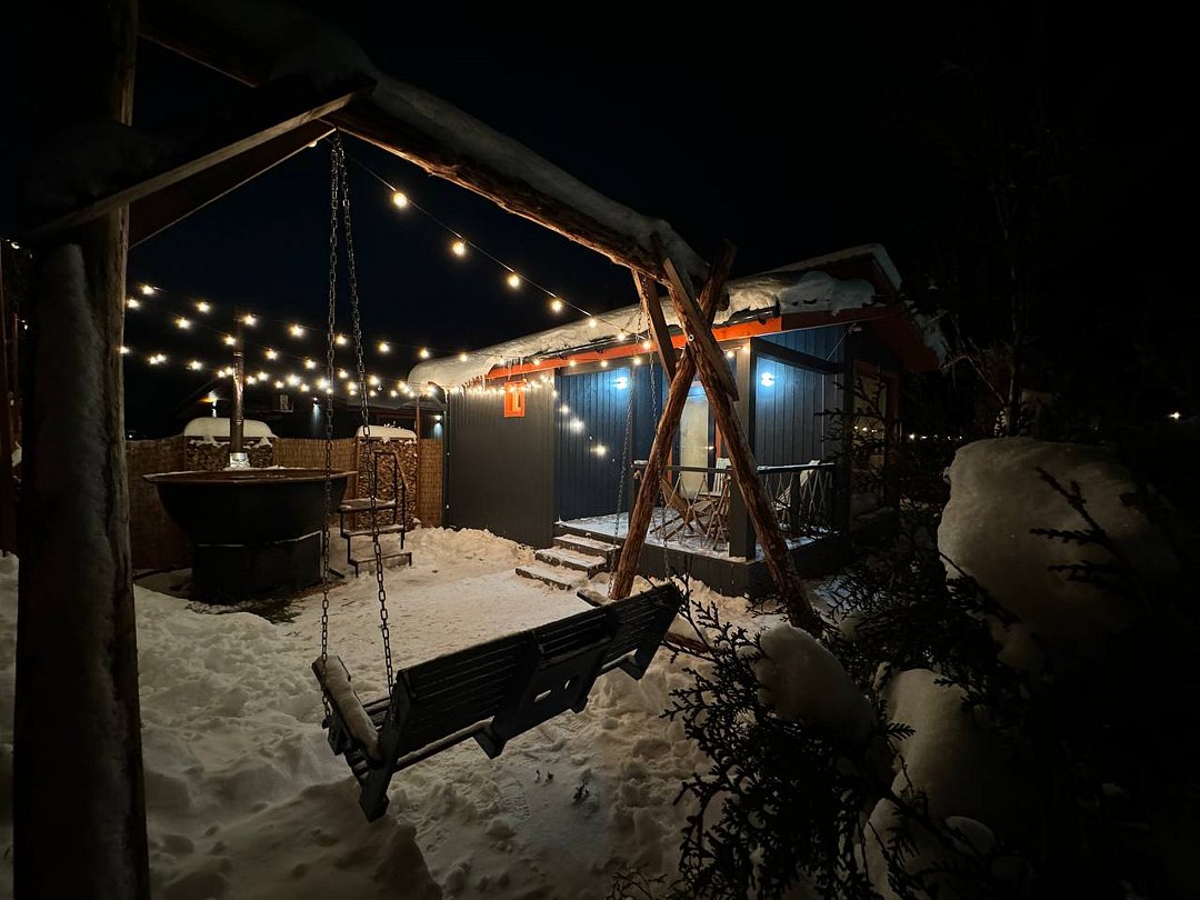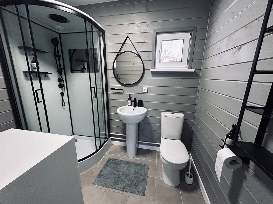 В ванной комнате вас ждет современная душевая кабина, фен, ватные диски и ушные палочки. Не упустите возможность насладиться свежим воздухом на личной веранде с уютными подвесными качелями и уличным столиком со стульями — идеальное место для завтрака на природе или вечерних посиделок.