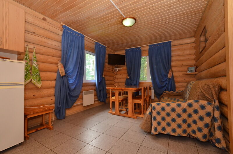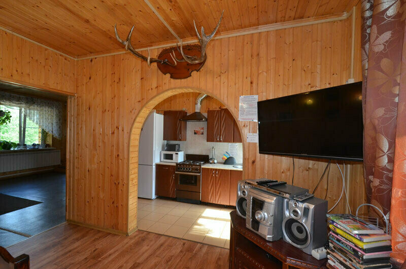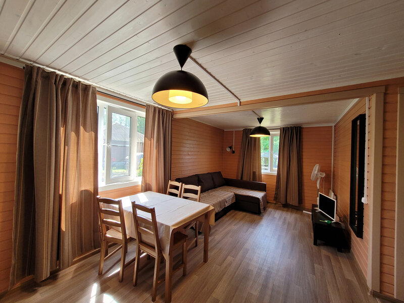 - кухня-гостиная с обеденным столом и маленьким диванчиком, есть ЖК-телевизор со спутниковой антенной (300 каналов). Кухня полностью оборудована: электрическая варочная панель, холодильник, электрический чайник, микроволновка, тостер, посуда для приготовления еды (кастрюли, сковородка, разделочные доски, ножи), столовая и чайная посуда, приборы, большое блюдо, поднос, шампуры.