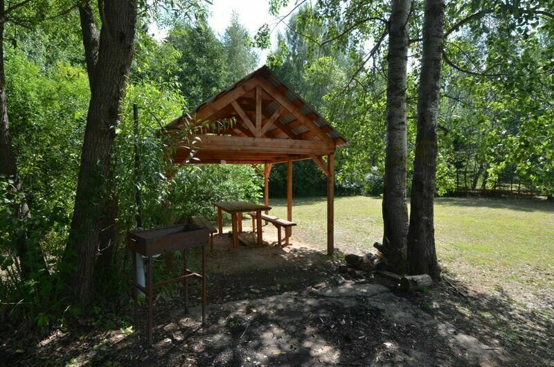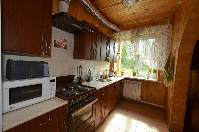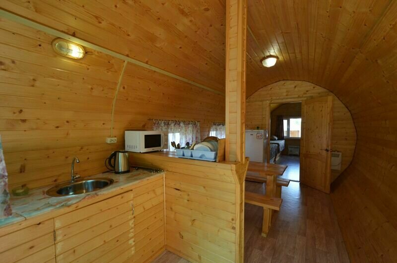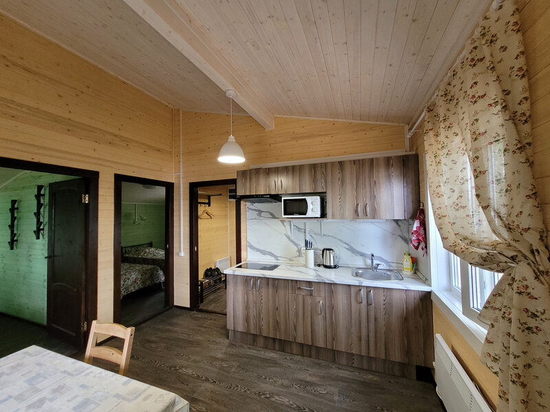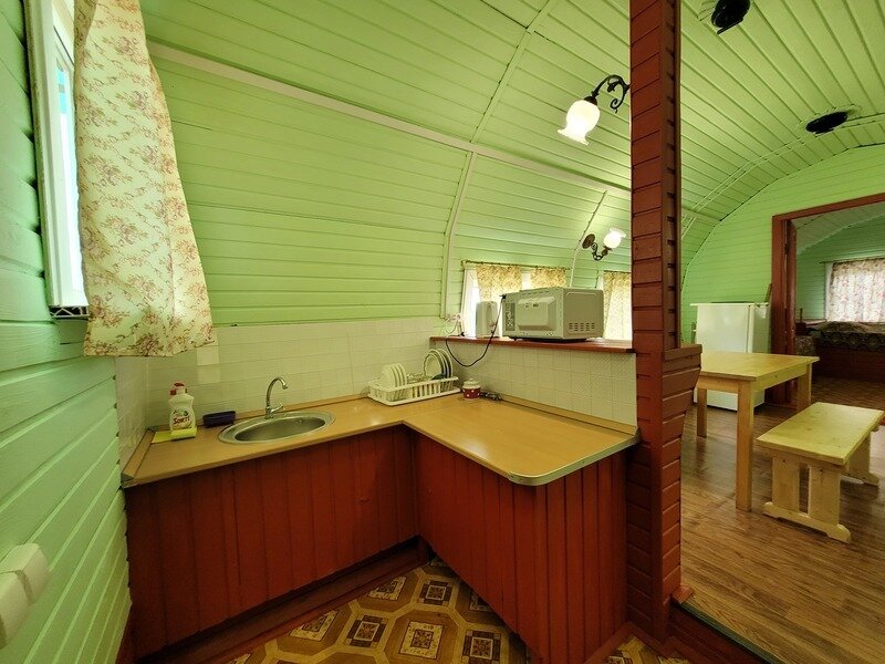 - кухня: стол с лавками, холодильник, электрический чайник, микроволновка, посуда на четверых человек, шампуры, подведена холодная вода.