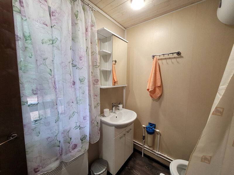 - ванная: душевая кабина, унитаз, умывальник, полотенце для рук, полотенце для ног, жидкое мыло.