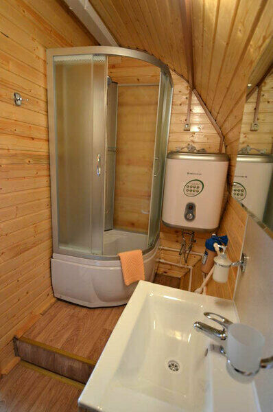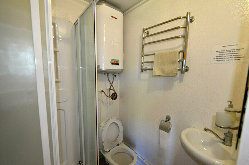 На 8 номеров 2 санузла, в каждом душевая кабина, унитаз, умывальник.