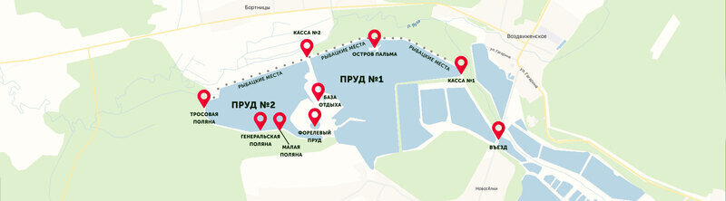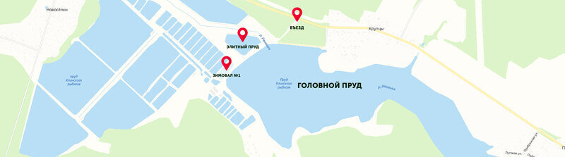 База отдыха расположена на участке Владимировка рыбхоза «Клинский» между двух больших прудов площадью 53 и 103 га. Здесь организована круглогодичная рыбалка на хищника (щука, окунь, форель) и летняя рыбалка на производственных прудах на карпа (от 1 до 6 кг). Берега обоих прудов оборудованы беседками, лавочками, столиками. Высокая плотность зарыбления гарантирует отличный улов.