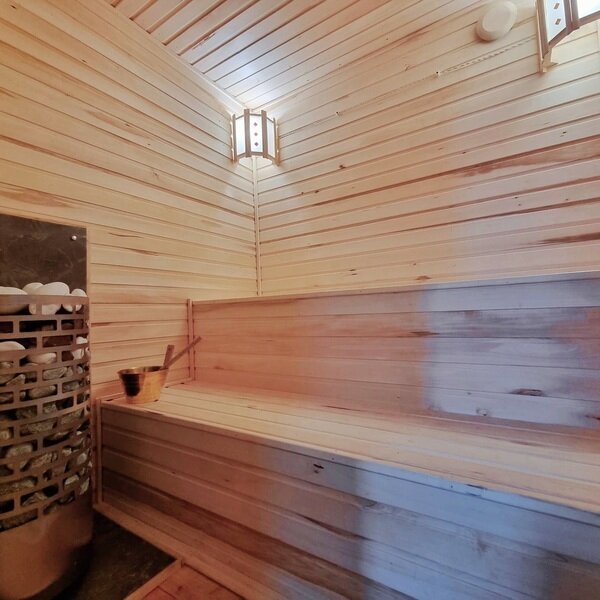 Удобства в доме: 2-х спальный диван, 2 спальная кровать, 2 односпальные кровати, шкаф, буфет, ЖК телевизор большой, холодильник, свч, кулер/чайник, фен, совместный сан. узел, сауна.