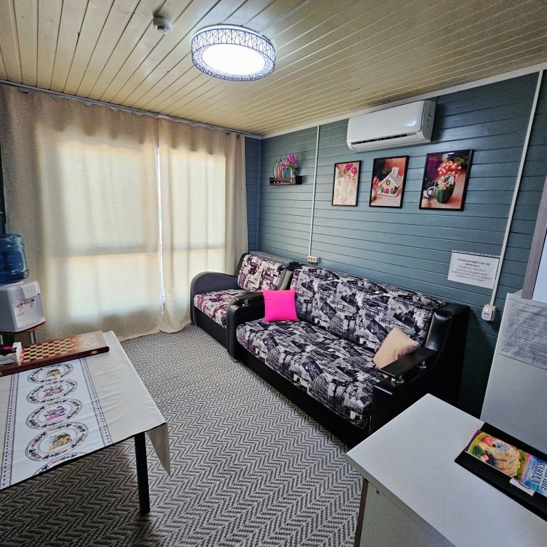 Удобства в доме: 2-х спальный диван, 1 спальное кресло-кровать, шкаф, буфет, ЖК телевизор большой, холодильник, свч, кулер/чайник, фен, совместный сан. узел.
