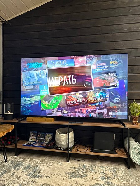 В доме есть огромный телевизор, где вы сможете посмотреть любимые фильмы или поиграть в FIFA 2023 или Mortal Combat на PlayStation 4.