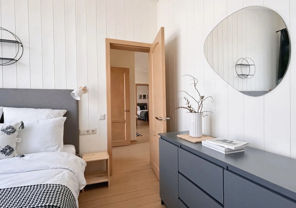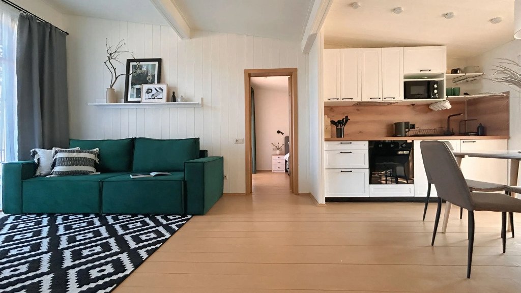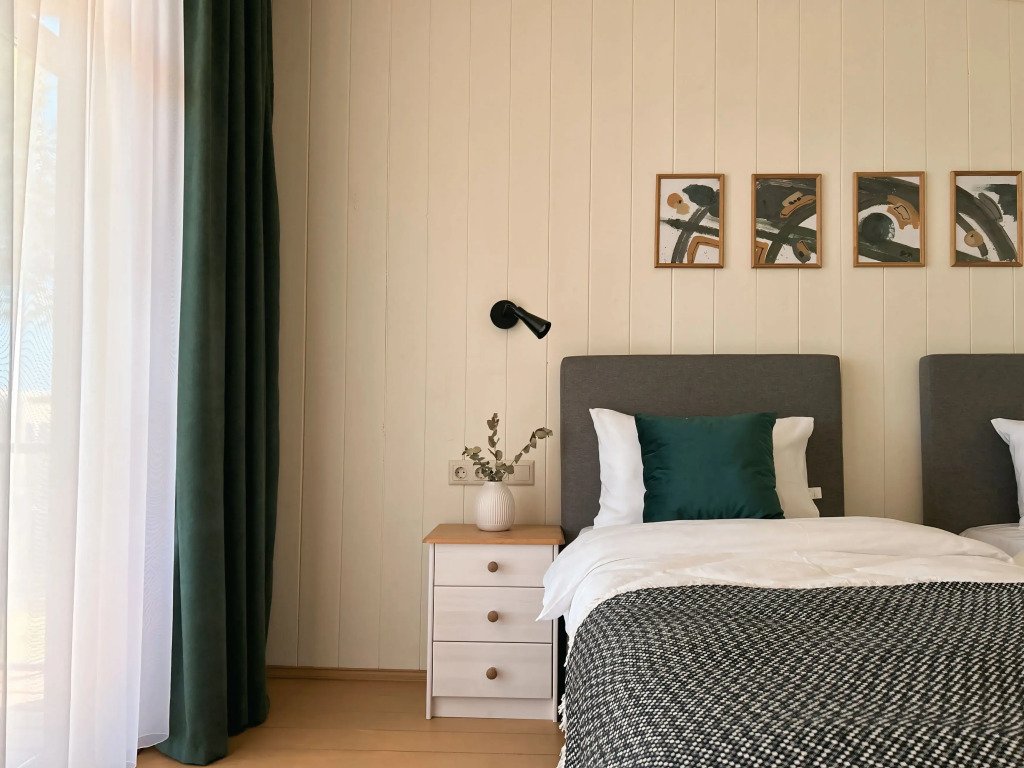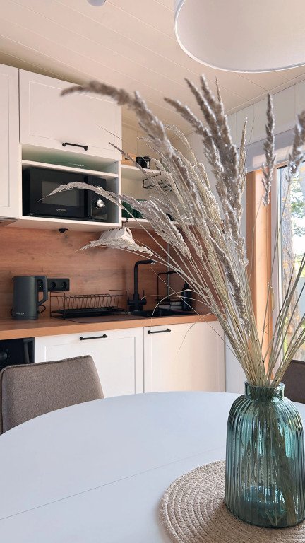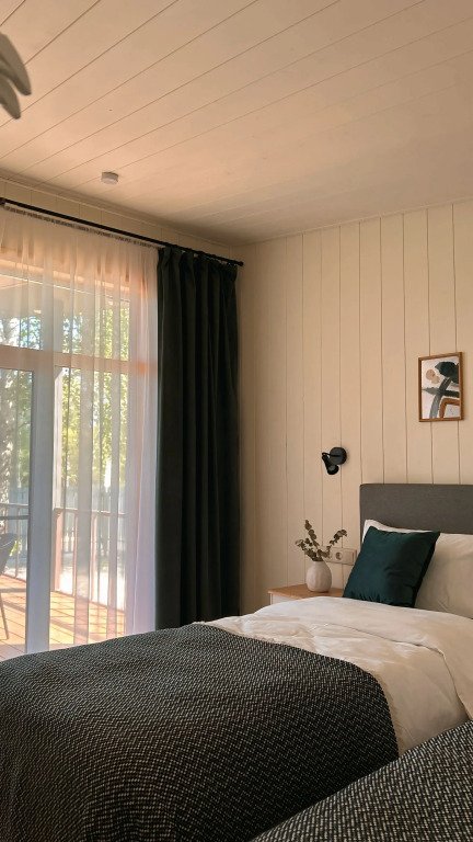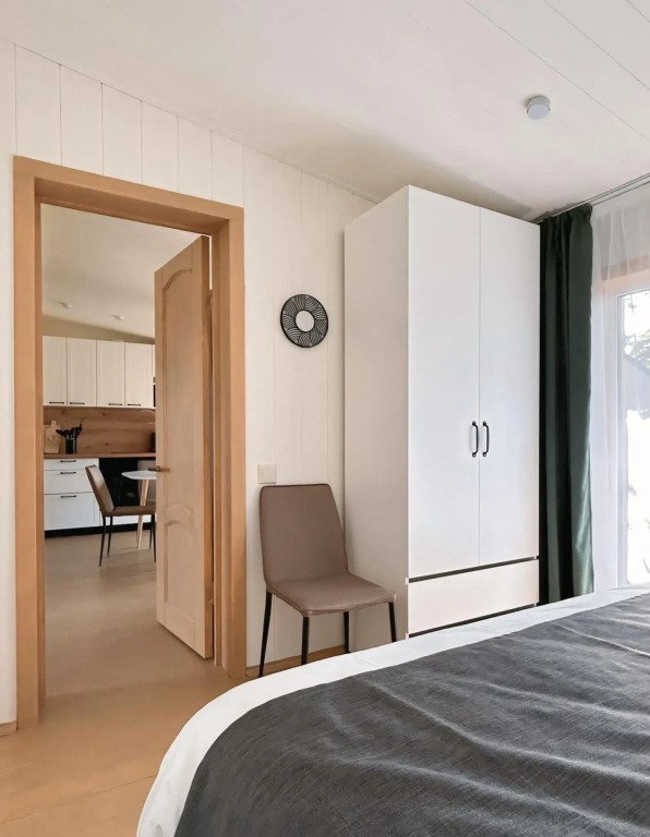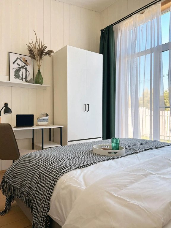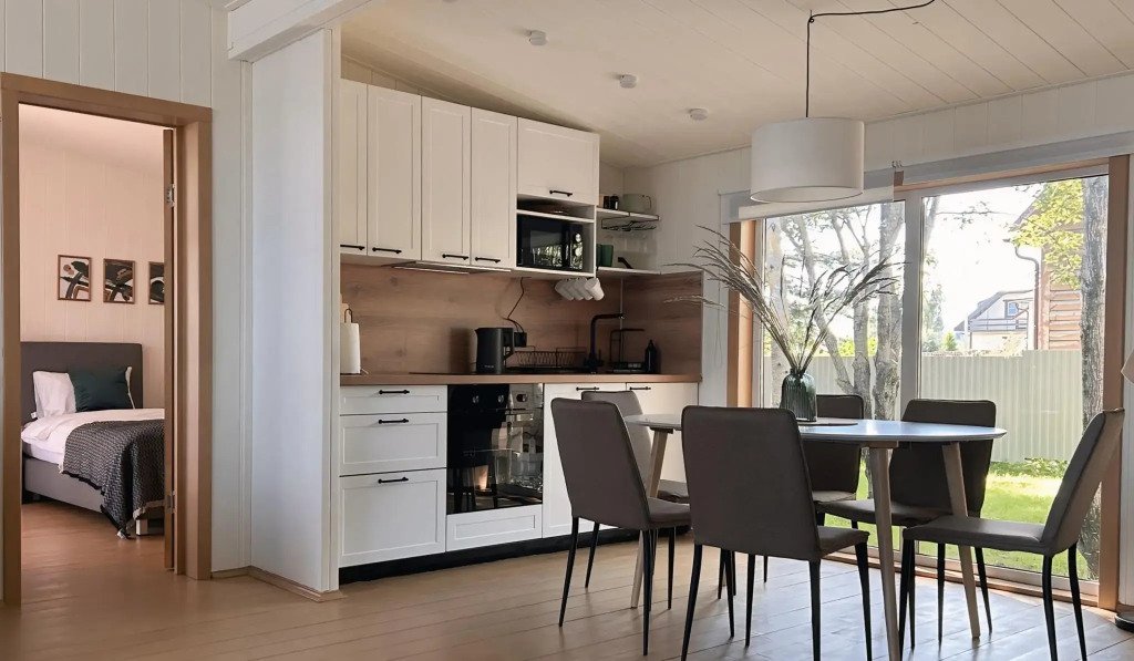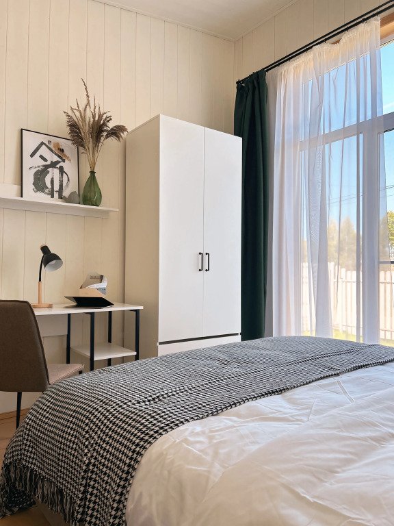 В доме несколько спален: в первой комнате, оборудованной собственным туалетом раковиной, расположена кровать размером 160x200 см, во второй комнате — кровать 160x200 см, в третьей — две кровати 90x200 см. В гостиной диван размером 160x200 см. Гости обеспечиваются постельным бельём, полотенцами, тапочками, феном, средствами гигиены и зубными наборами. Кухня укомплектована посудой, посудомоечной машиной, варочной панелью, холодильником, чайником, кофемашиной, а также шампурами, солью, сахаром, специями, чаем, маслом и крупами.