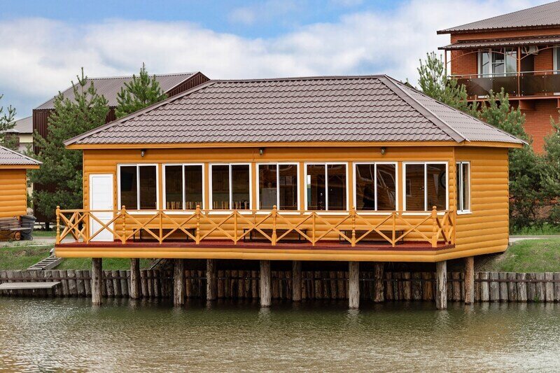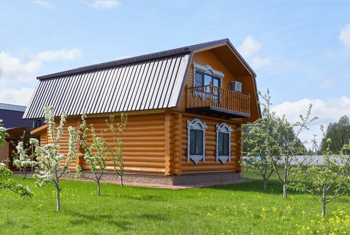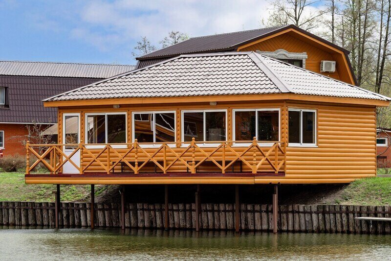 Двухэтажный коттедж в русском стиле с видом на озеро
