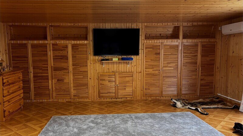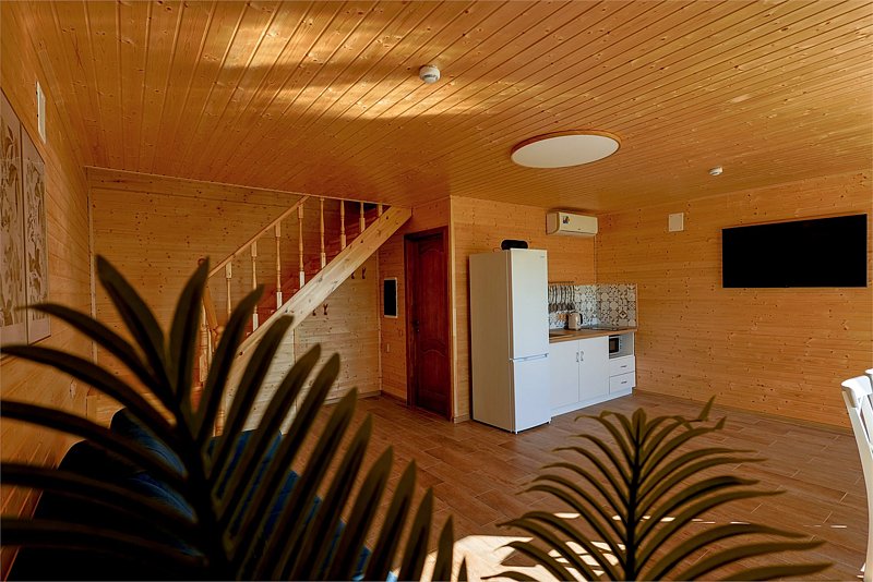 Второй этаж: двуспальная кровать, двуспальный раскладной диван, телевизор. Кондиционер на каждом этаже.
