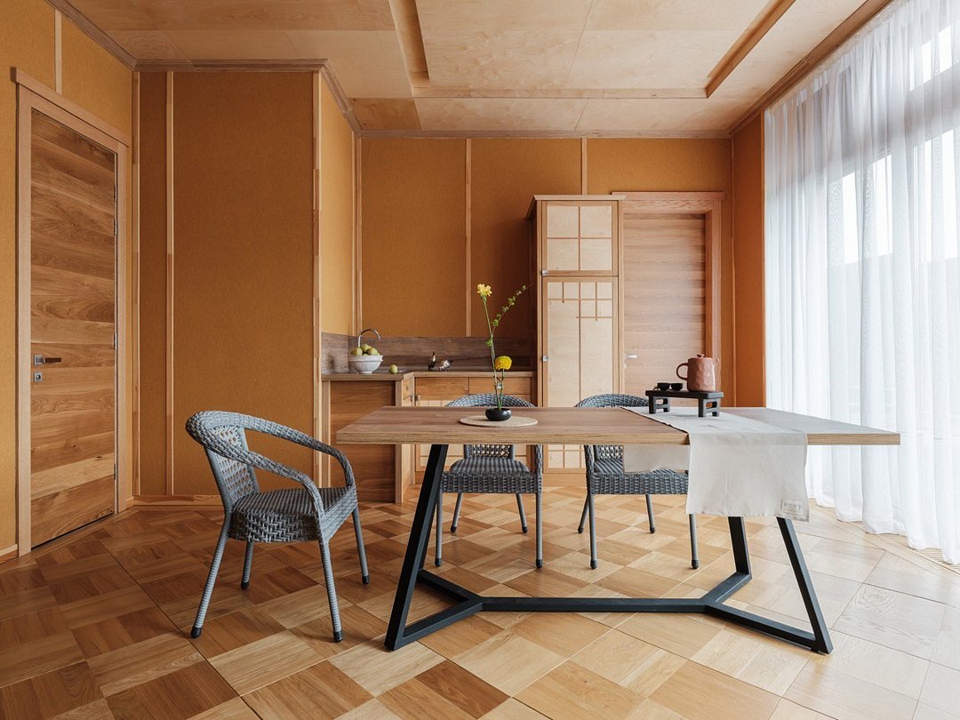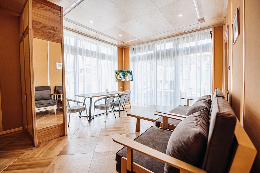 Гостиная представляет собой просторное помещение с комфортабельными диванами, которые раскладываются. Здесь вы можете отдохнуть после долгого дня, посмотреть телевизор или провести время в компании гостей. Гостиная также оснащена столом для работы или игр, и шкафом для хранения вещей. Отделка выполнена из высококачественных материалов, а интерьер оформлен в японском стиле. Атмосфера роскоши и уюта, чтобы вы могли полностью насладиться своим пребыванием.