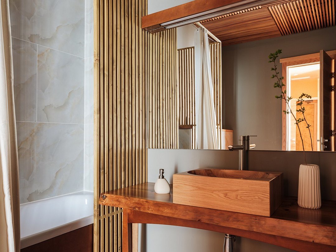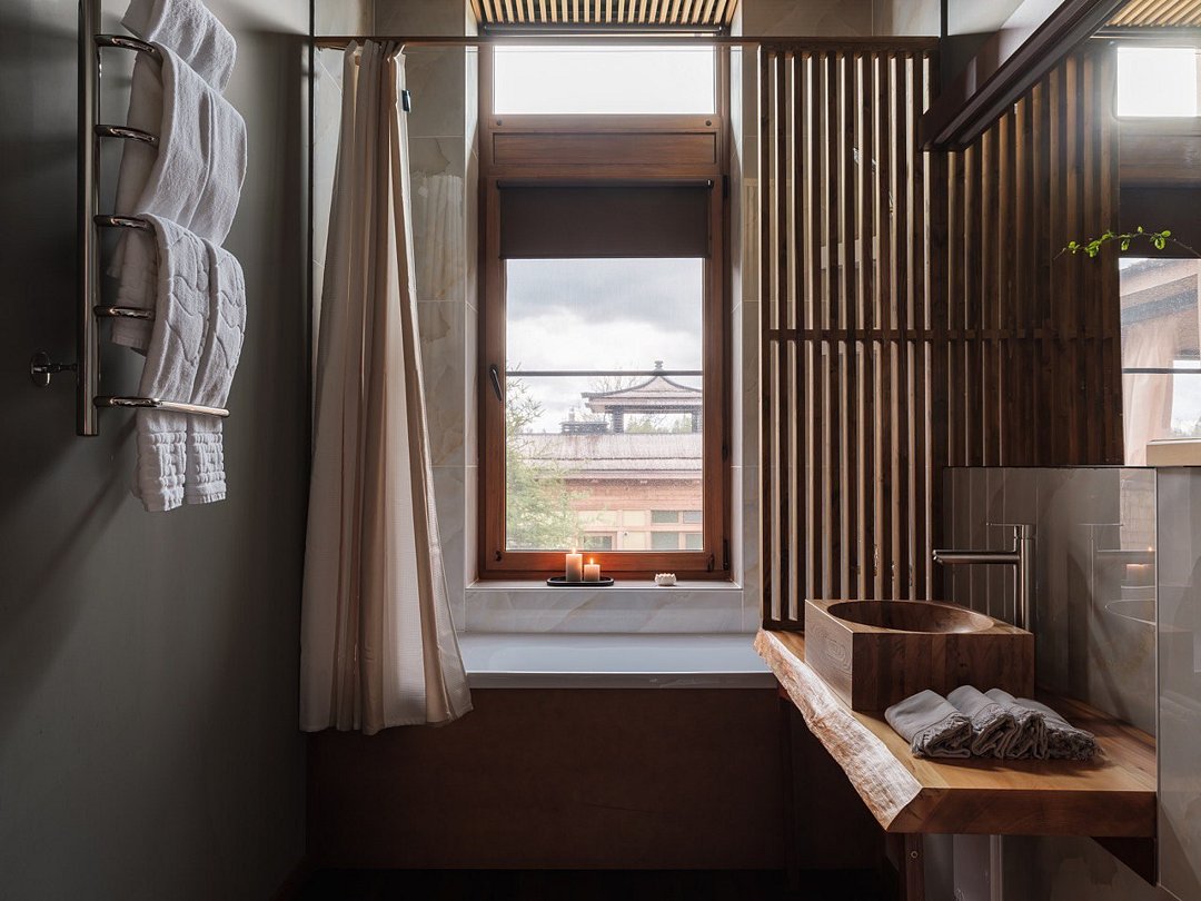 В ванной комнате вы найдете все необходимое для роскошного отдыха, включая ванну с видом на сад, отдельную душевую кабину и раковиной из настоящего дерева.