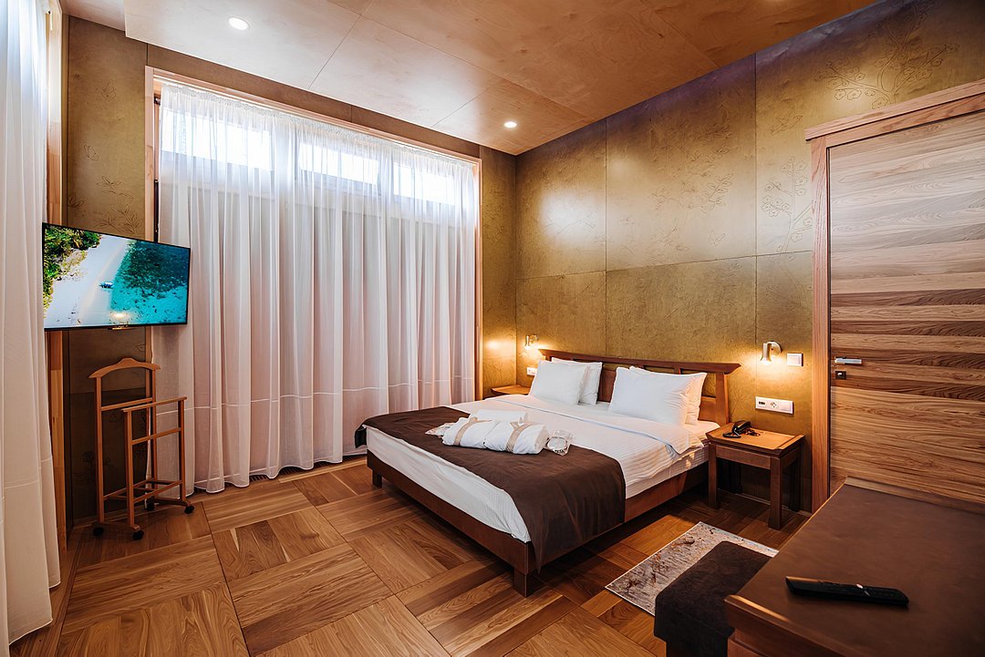 Дом с сауной — это роскошное пространство, созданное специально для тех, кто ищет высокий уровень комфорта и уединения. В доме вы найдете просторную спальню с комфортной кроватью и элегантной мебелью, сауной и бочкой фурако на террасе. В отдельной гостиной вы сможете провести время в уютной обстановке, наслаждаясь прекрасным видом на окружающую природу. Гостиная также оснащена большим плоским телевизором для вашего развлечения.