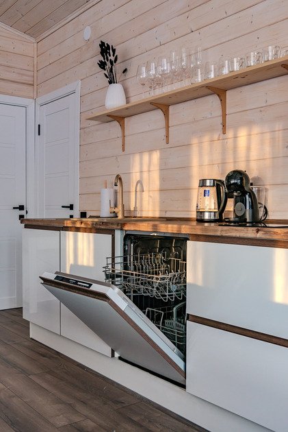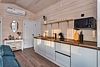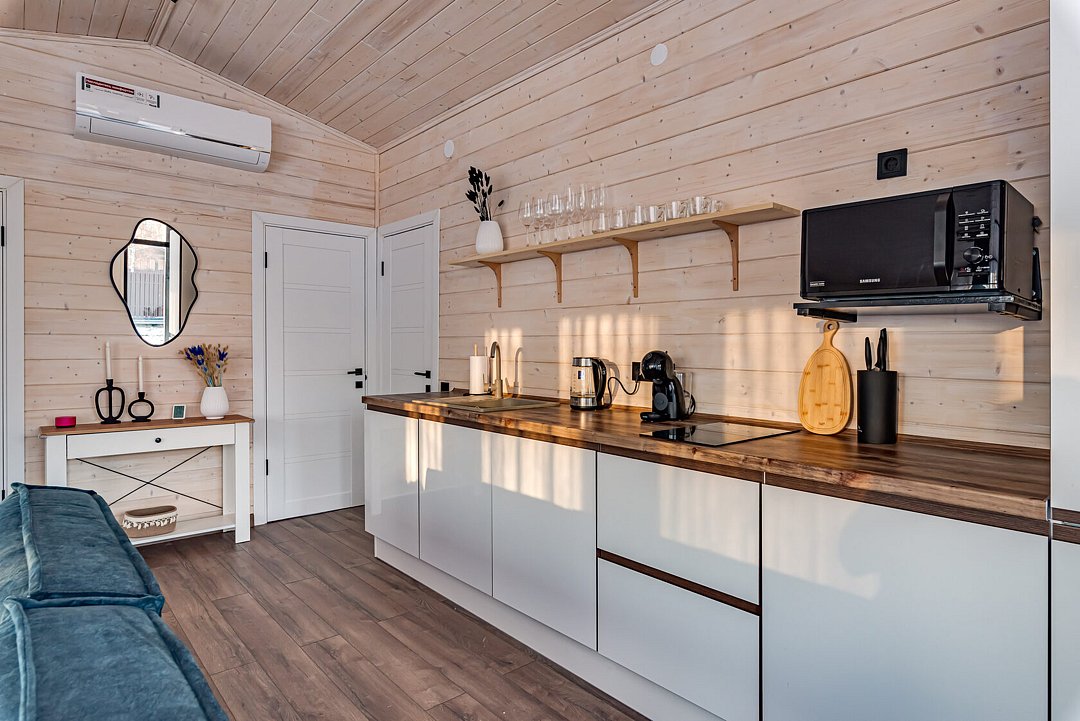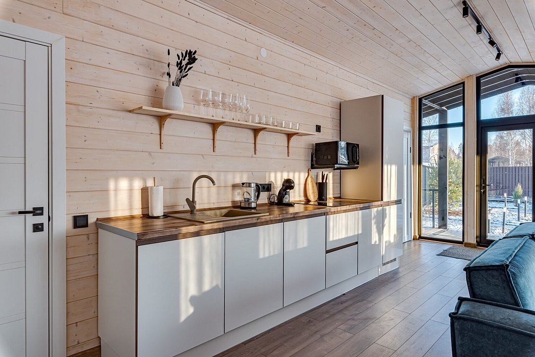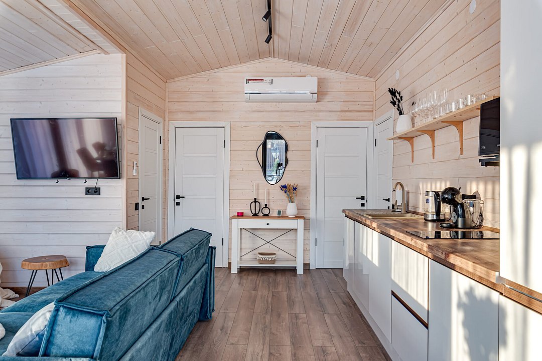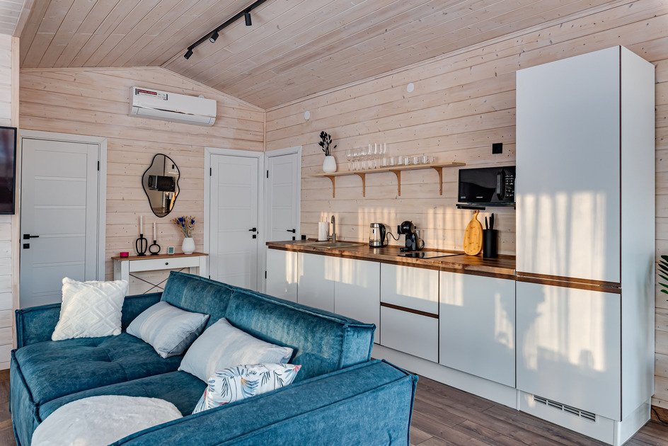 Центром притяжения в доме станет большая кухня-гостиная с камином, где можно провести время в кругу близких. Для релаксации после активного дня на свежем воздухе предусмотрена электрическая сауна. Все необходимое для комфортного проживания уже включено: современная техника, посуда, свежее постельное белье и полотенца, а также средства гигиены. Гости могут воспользоваться Wi-Fi и Smart-TV для развлечения, а умная колонка с Алисой поможет создать нужное настроение и управлять устройствами.