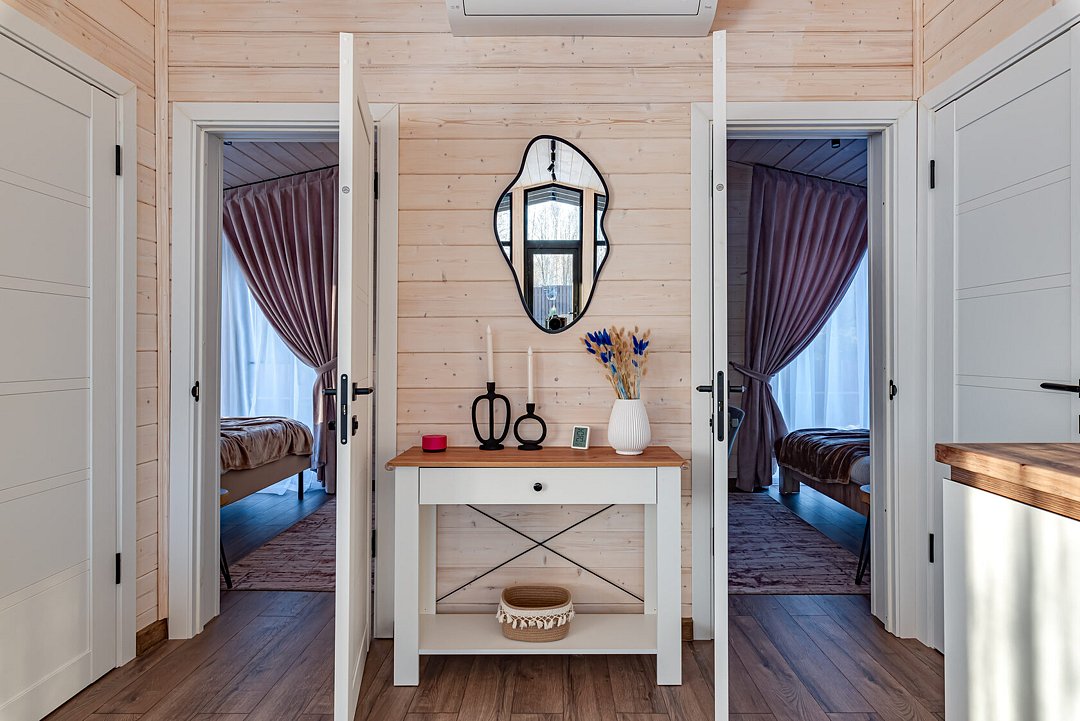 Дом оборудован Wi-Fi, Smart-TV и колонкой с Алисой, что позволяет создать идеальные условия для отдыха. Особенно приятно включить музыку, зажечь свечи и наслаждаться видом из окон.