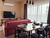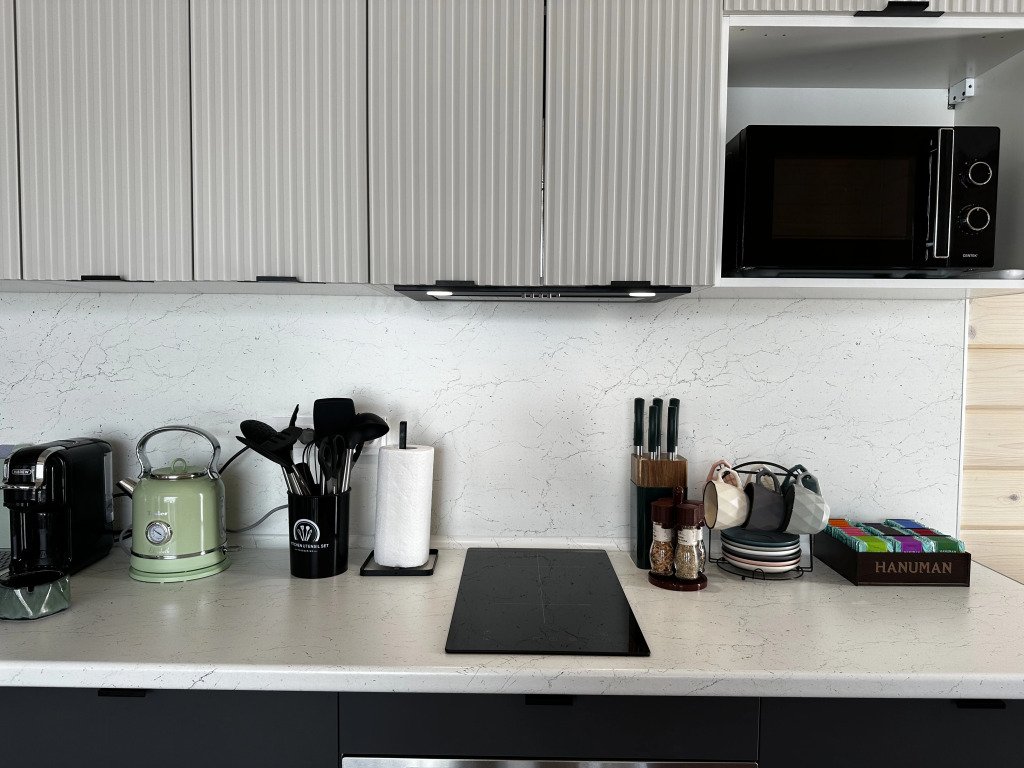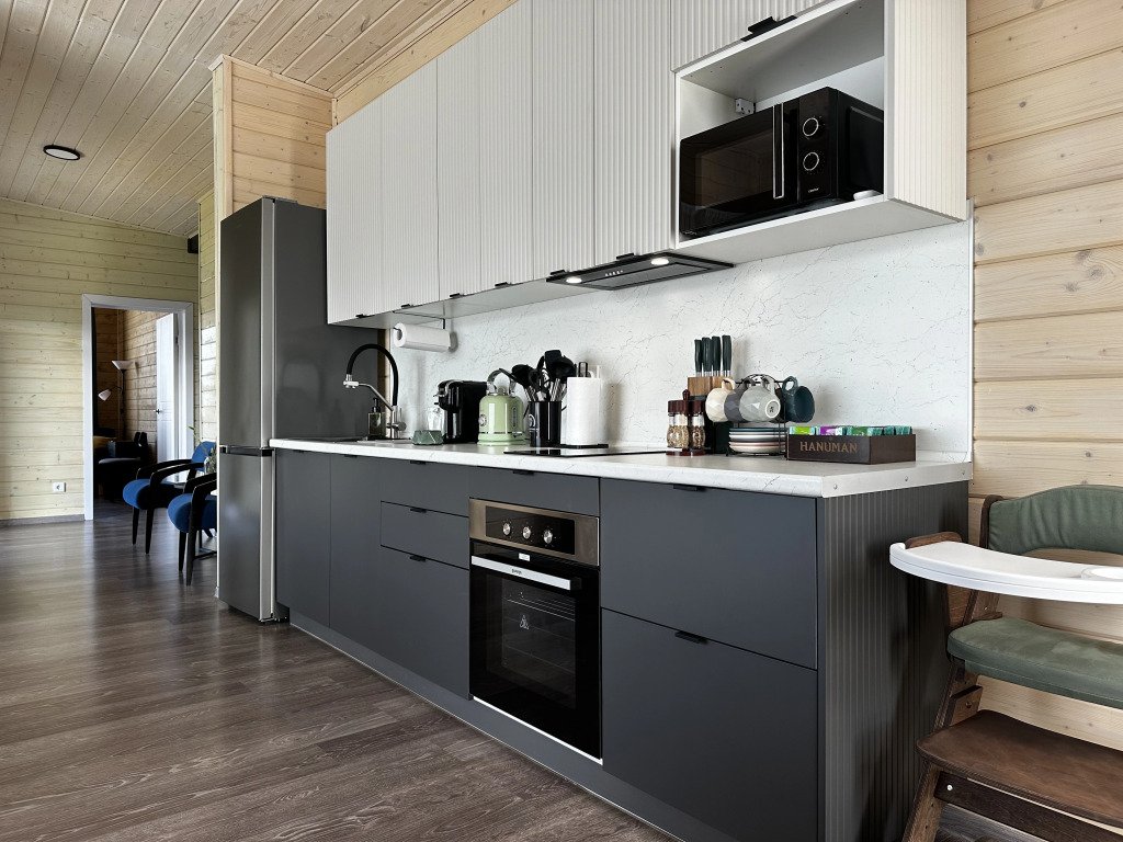 Кухня оборудована необходимыми принадлежностями для готовки и техникой: холодильник, посудомойка, кофемашина.