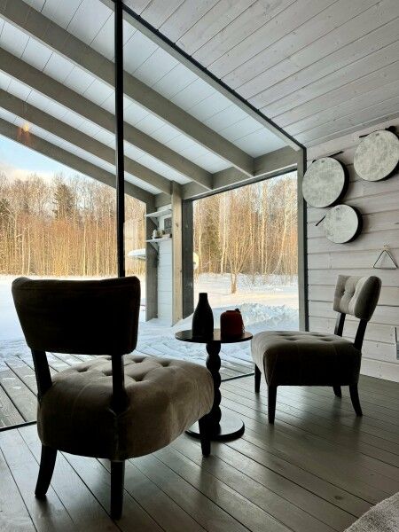Техника: ПММ, духовка, варочная панель, большой холодильник, стиральная машина, колонка Алиса, ТВ. В гостиной камин, около веранды мангал. На веранде стол и стулья. Дом не огорожен забором, при этом вы никого не видите и вас тоже, если не захотите этого сами.