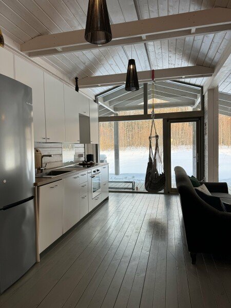 В просторной кухне-гостиной с камином вы сможете насладиться теплом и уютом, собравшись за обеденным столом. Удобный диван и телевизор позволят расслабиться после насыщенного дня. Кухонная зона оснащена всем необходимым: фильтры для воды, индукционная плита, вместительный холодильник, посудомоечная машина, электрический чайник и полный набор посуды для готовки и сервировки.