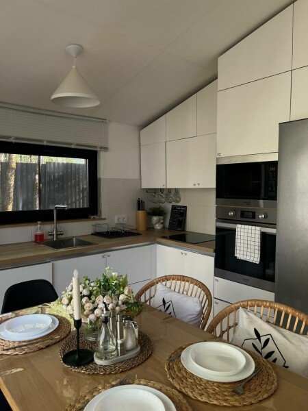 На оборудованной кухне вы найдете все необходимое для кулинарных шедевров: фильтр с питьевой водой, кофемашину, микроволновку и вместительный холодильник. Уютный обеденный уголок станет идеальным местом для совместных застолий, а в ванной комнате вас порадуют качественные средства для душа и стиральная машина для вашего удобства.