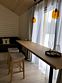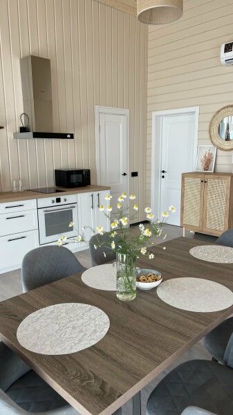 Дом площадью оборудован всем необходимым: постельное белье, полотенца, фен, полностью укомплектованная кухня (СВЧ-печь, индукционная плита, посудомоечная машина, холодильник, чайник, посуда), конвекторы и кондиционер.
