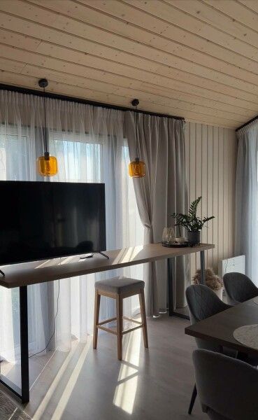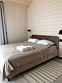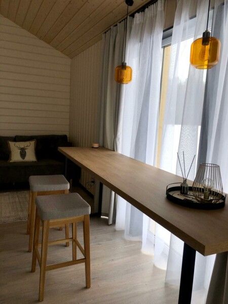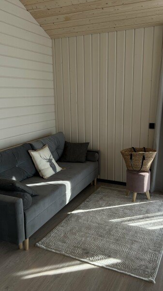 В спокойном интерьере вы найдете все необходимое для комфортного проживания: две изолированные спальни с двуспальными кроватями, просторная кухня-гостиная с раскладным диваном и большим телевизором, санузел с душевой кабиной, а также собственная сауна и зона барбекю с мангалом и очагом.