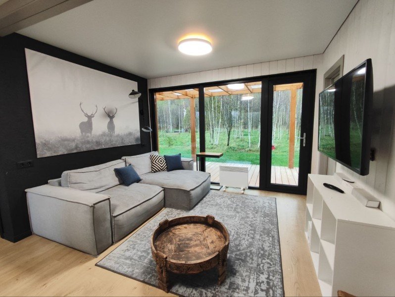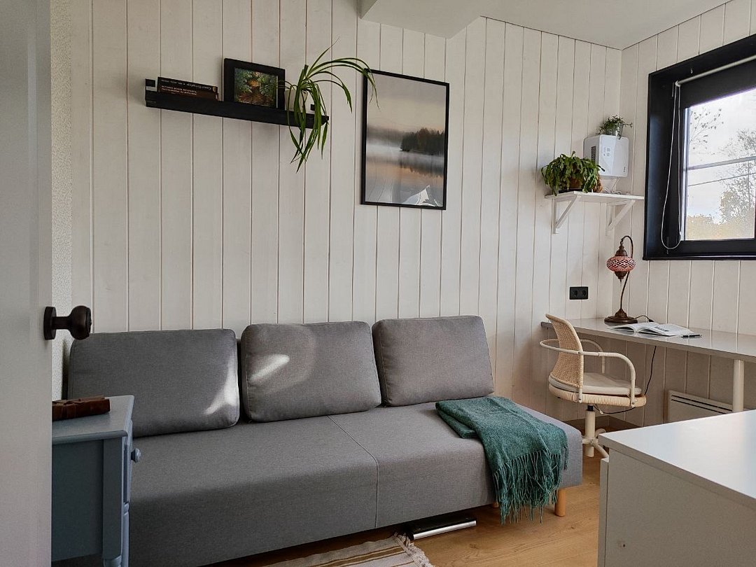 Также в домике есть просторная гостиная с уютным креслом и диваном.