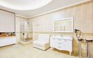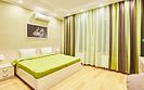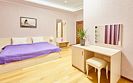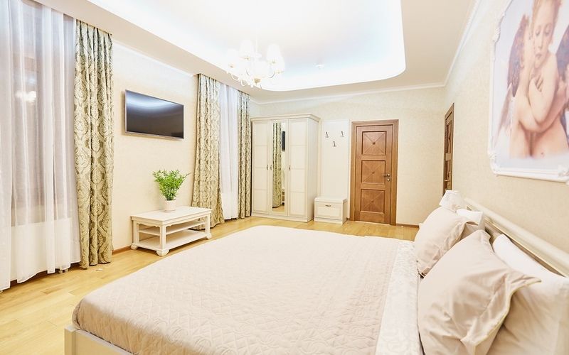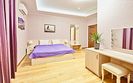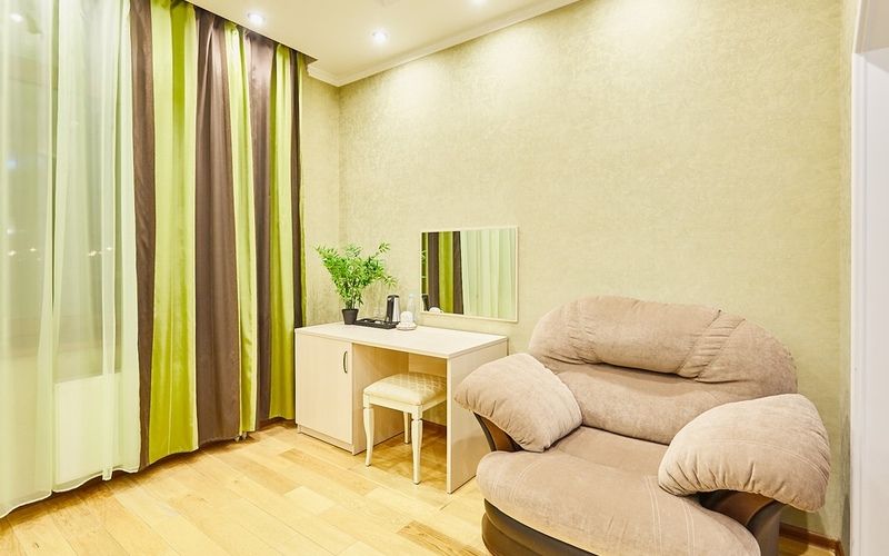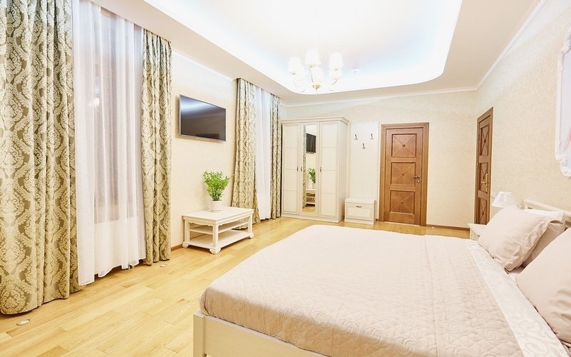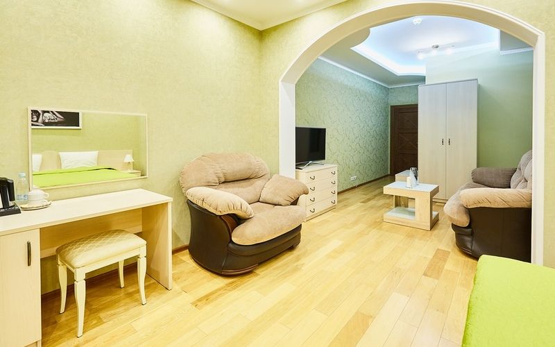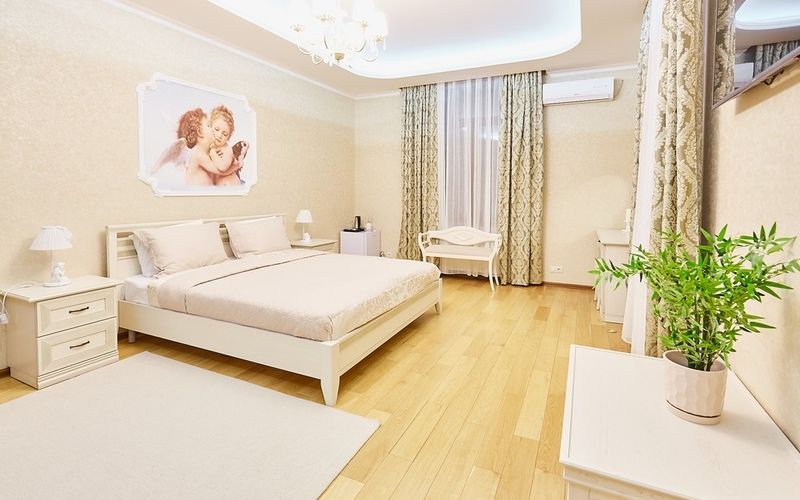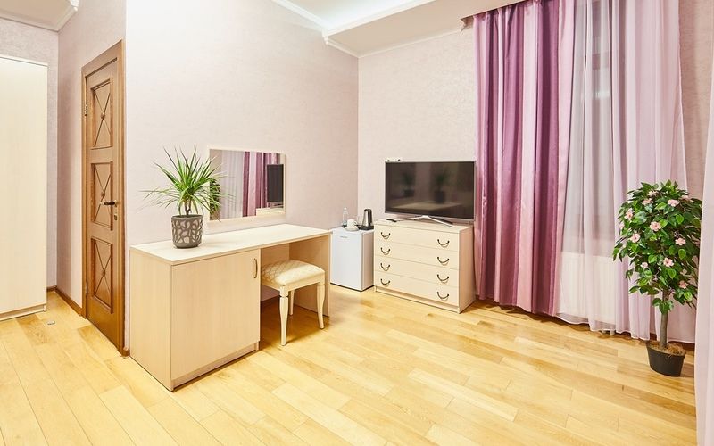 Номер рассчитан на 2х персон, интерьер которого выполнен в сдержанном классическом стиле, цветовая гамма в пастельных тонах, так же присутствует система дополнительного освещения.
