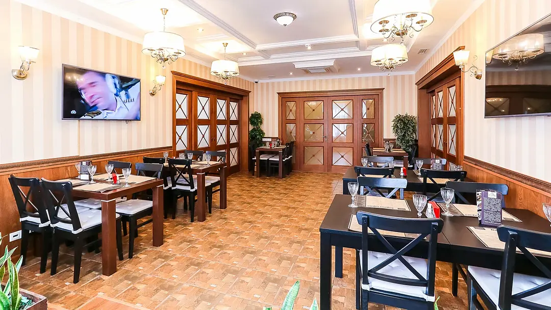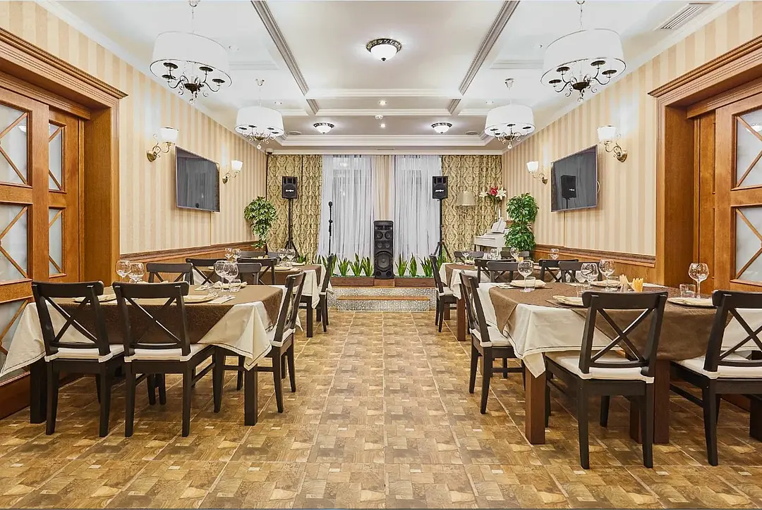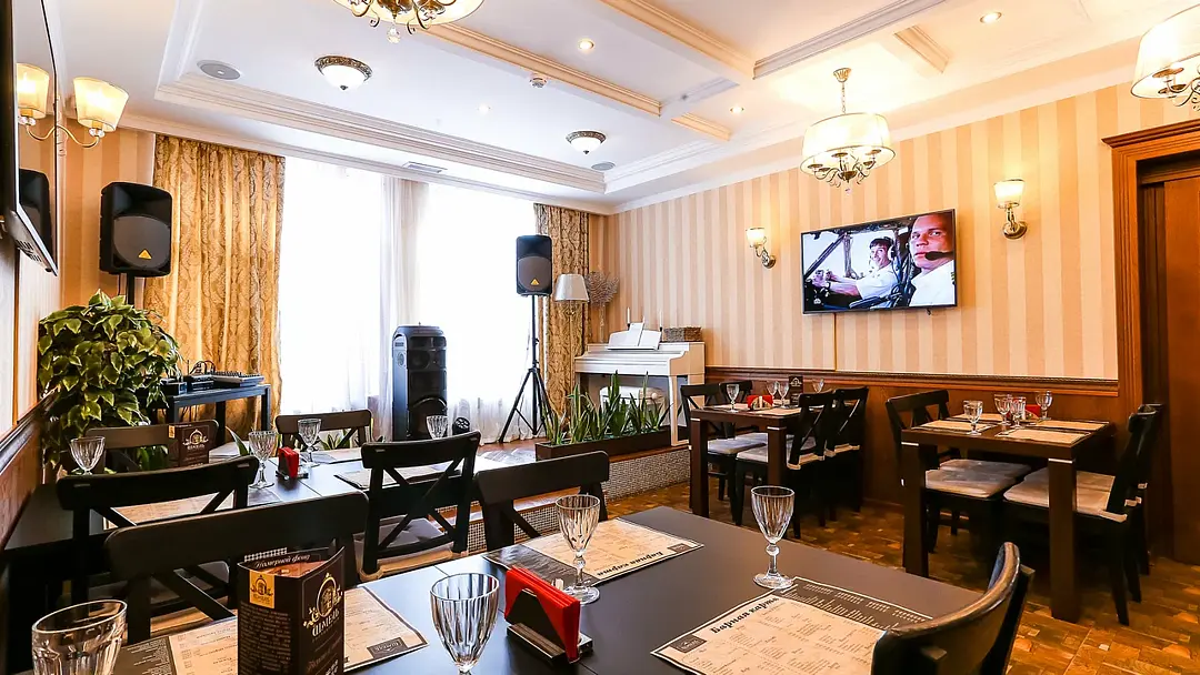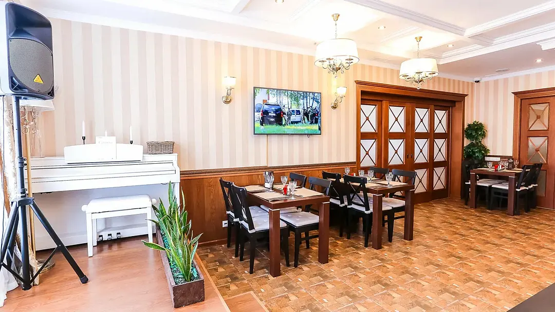Большой зал, он же главный зал ресторана. Выполнен в классическом стиле со спокойным цветовым решением. В зале располагается сцена с фортепиано и другим музыкальным оборудованием. В этом же зале Вы можете спеть в караоке.