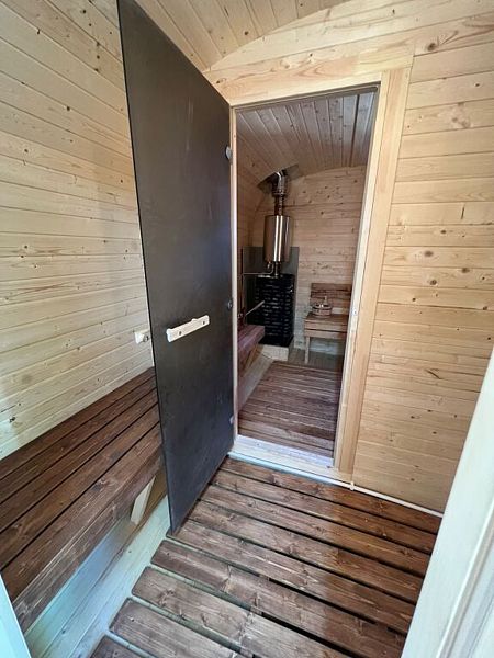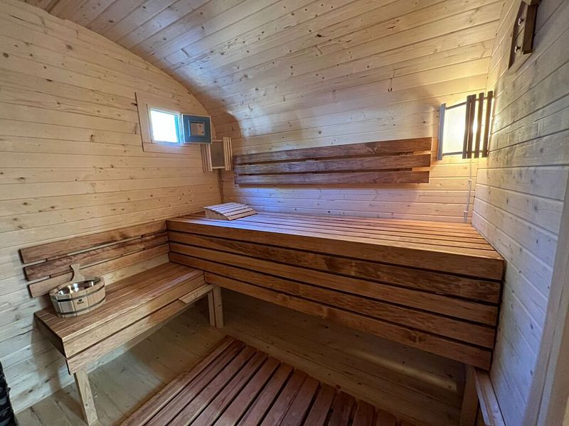 В доме имеется двуспальная кровать, зона с кухонным гарнитуром со всей необходимой посудой, холодильник, свч-печь, санузел с душем, Wi-Fi, своя баня, своя горячая купель с дровяным подогревом, зона для барбекю и печью для казана. Также около дома имеется небольшая лаунж-зона с креслами и костровой чашей. В светлое время суток там можно отдохнуть или позагорать летом, а в темное время организовать кинопоказ у костра.