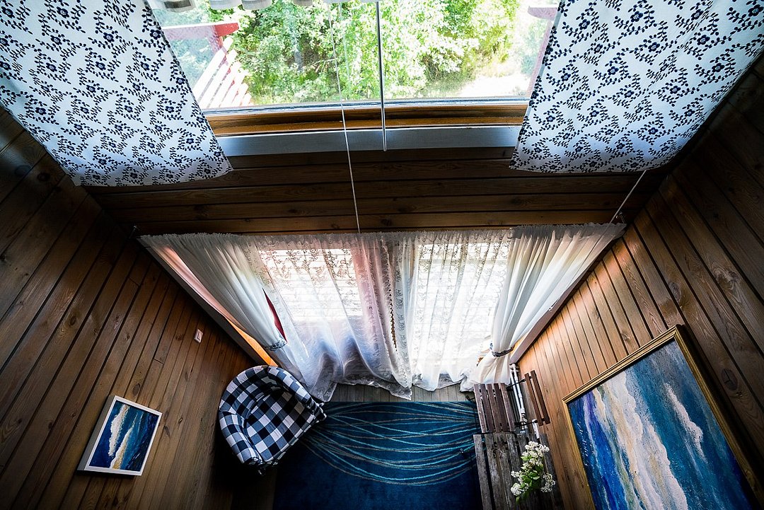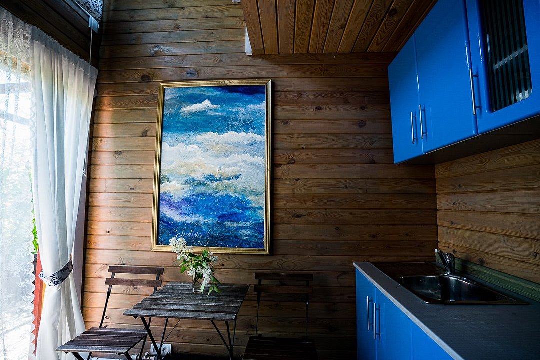 На первом этаже двухуровневого апартамента, расположилась небольшая кухня и обеденная зона с деревянным столиком и стульчиками, из окон, высотой в два этажа и вторым светом открывается вид на романтичную веранду в окружении сочной зелени. Из кухни двери ведут прямиком на уединенную открытую лесную террасу, две двери для входа внутрь и выхода на веранду, уютная спальня с комфортной двуспальной кроватью с ортопедическими матрасами высотой 50 см на втором этаже с балконом и вторым светом, апартамент рассчитан на двух человек (включая детей до 3 лет). Без предоставления дополнительных мест.