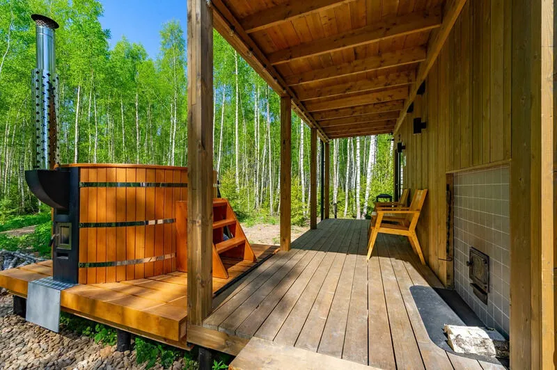 Инфраструктура: тапочки, купель, зона отдыха, полотенца, халатыНа территории глэмпинга, в укромном живописном уголке леса, размещены две лесные бани с настоящими дровяными печами и большими панорамными окнами.