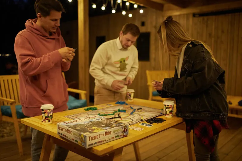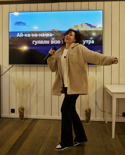 Чтобы гостям всегда было где собраться, независимо от погоды за окном, построен современный, теплый и уютный Банкетный зал! В нем проводятся кинопоказы, игры, работает караоке, а еще это прекрасный коворкинг в лесу!