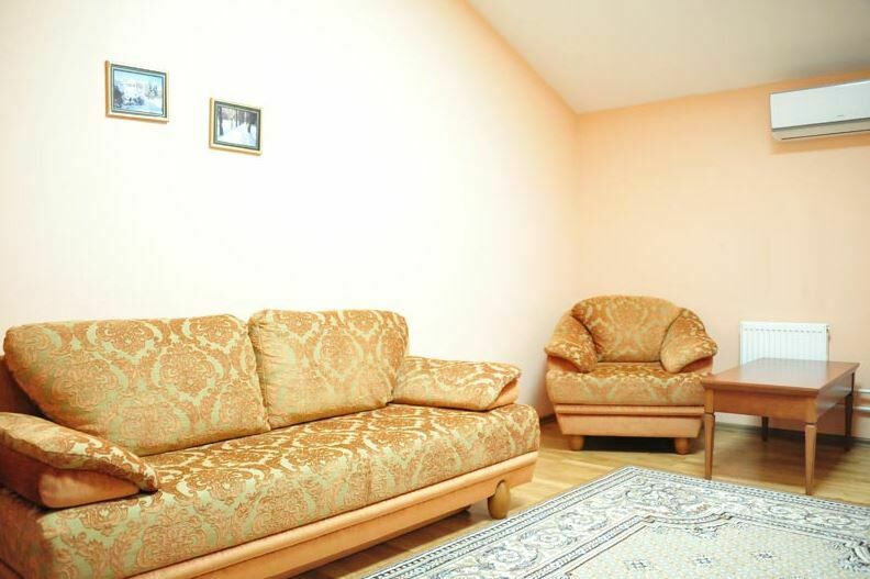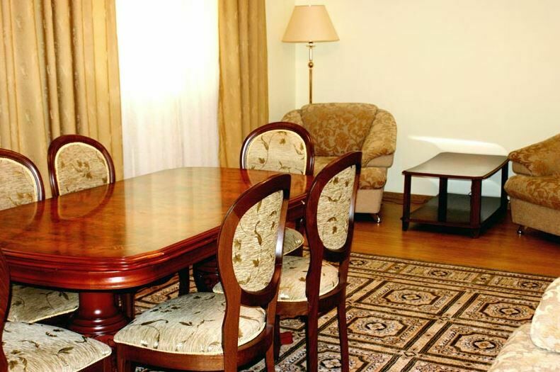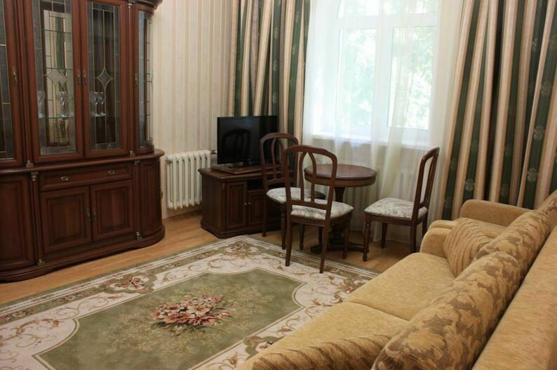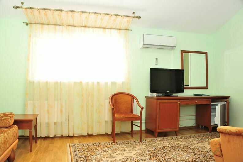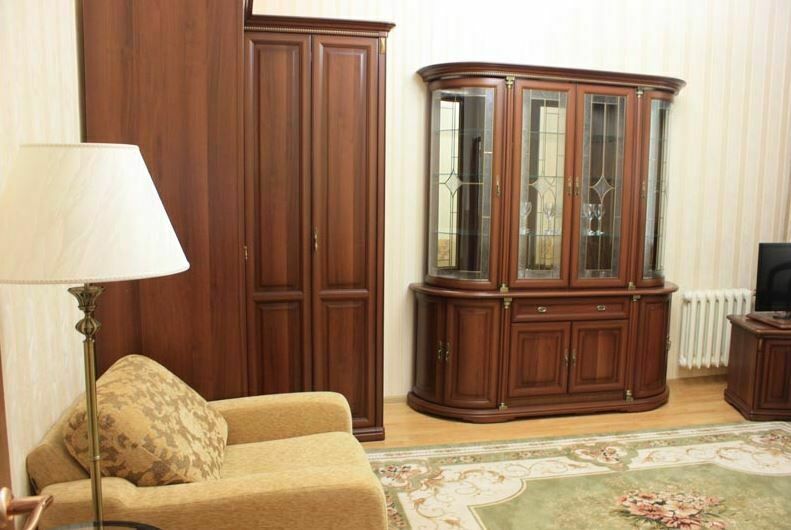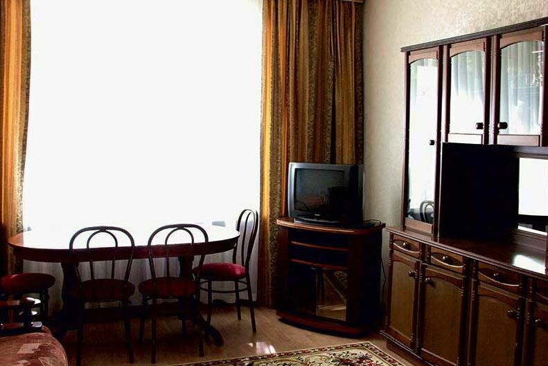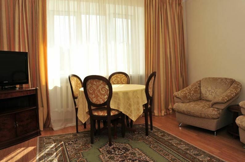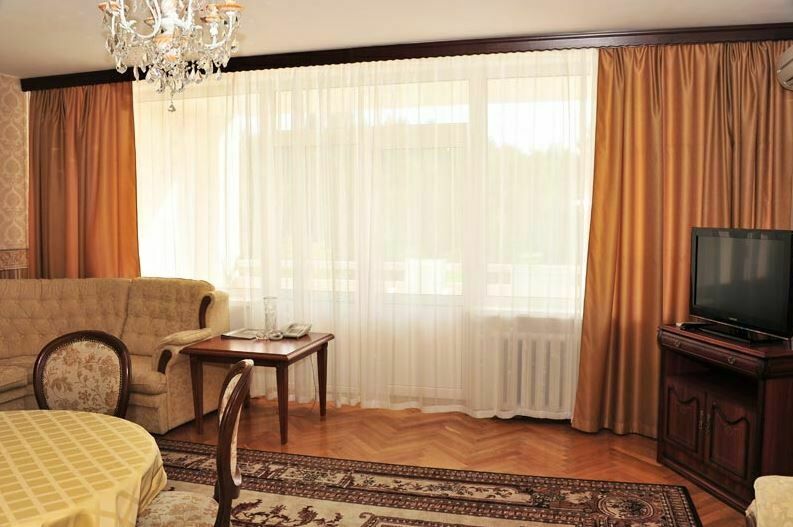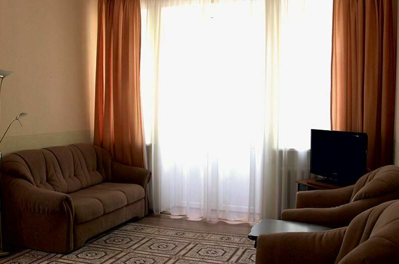 Апартаменты с лоджией, кондиционером, меблирован в классическом стиле, в просторной гостиной мягкая мебель, телевизор, в спальне – двухспальная кровать. В уютной кухне, электрочайник, холодильник, посуда, столовые приборы на 6 персон. В номере два санузла с угловой ванной, стиральной машиной-автомат, феном.