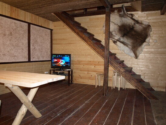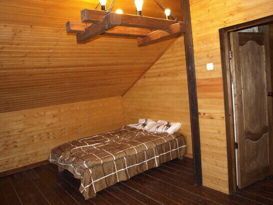 Два этажа, 110 кв.м., Русская баня на дровах, три спальни, большая гостиная, оборудованная кухня, прихожая, душевая, туалет.