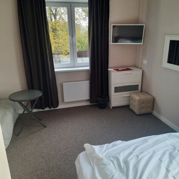 В номере одна двуспальная кровать, раскладной диван, ТВ, душ, туалет, стол, комод, окно во двор, Wi-fi.