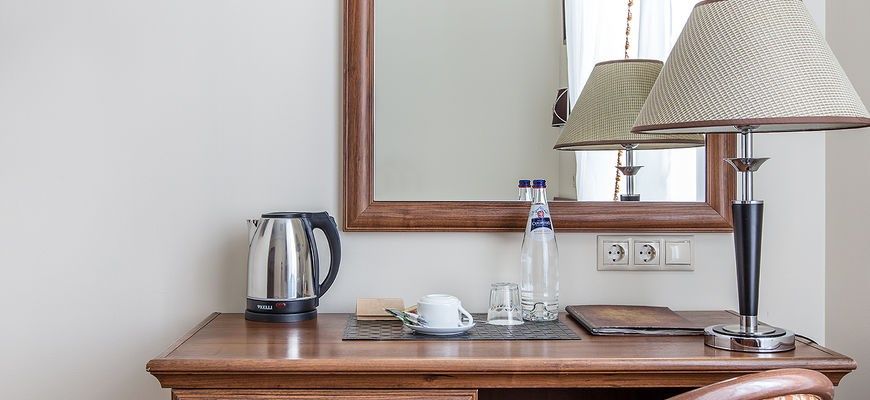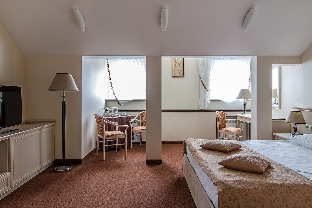 Во всех номерах этой категории есть специально выделенная зона, которая оборудована всем необходимым для уединенного чаепития или ужина. Номер оборудован мини – баром, телевизором, телефоном. Этот номер идеально подойдет для романтических выходных, и гостей, которые даже в путешествиях любят комфорт и домашний уют. Оборудован: телевизором с кабельным телевидением мини-баром с различным ассортиментом напитков и закусок набором мини-парфюмерии,халатом,тапочками,феном,чайником, чайным набором