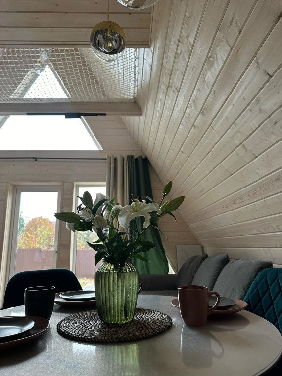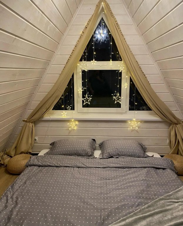 Дом выполнен в архитектурном стиле A-frame. Вместимость — до четырёх взрослых гостей. Возможно размещение одного ребёнка на дополнительном спальном месте. Спальные места: кровать с двуспальным ортопедическим матрасом Askona на втором этаже и раскладной диван на первом этаже.