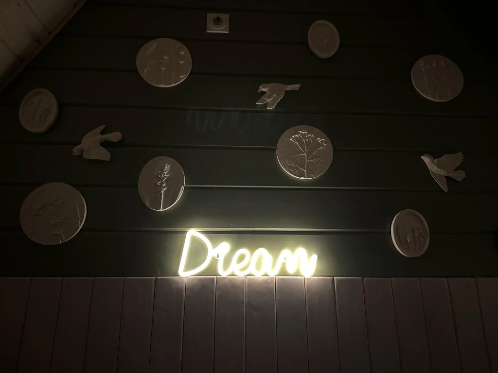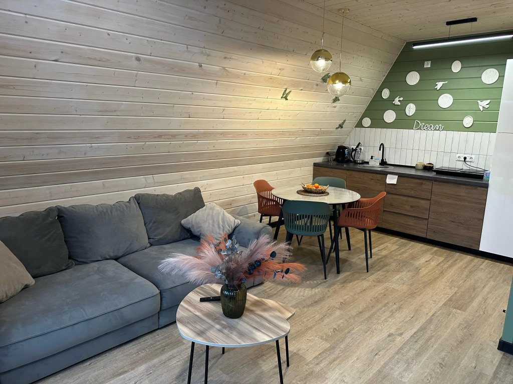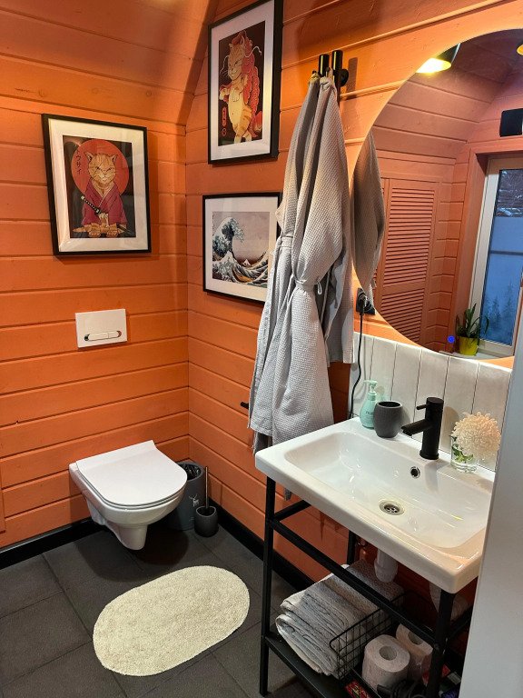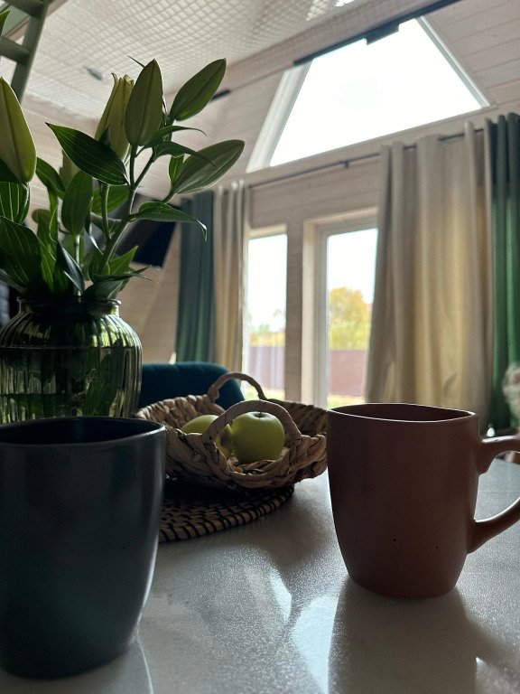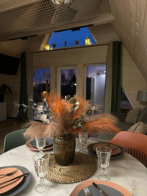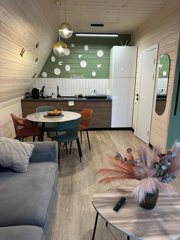 Внутреннее оснащение: система тёплого пола, голосовой помощник, панорамные окна, терраса с мебелью, телевизор с доступом в интернет, Wi-Fi, утюг. На территории: японская баня фурако, зона барбекю, костровая зона, парковка.