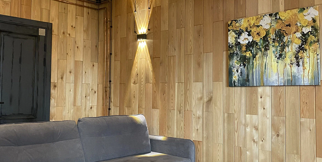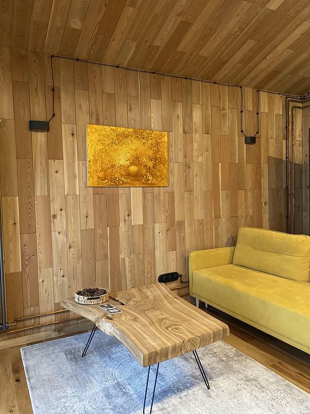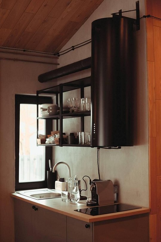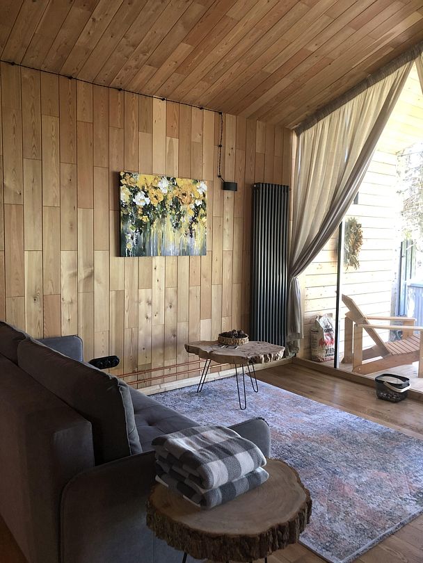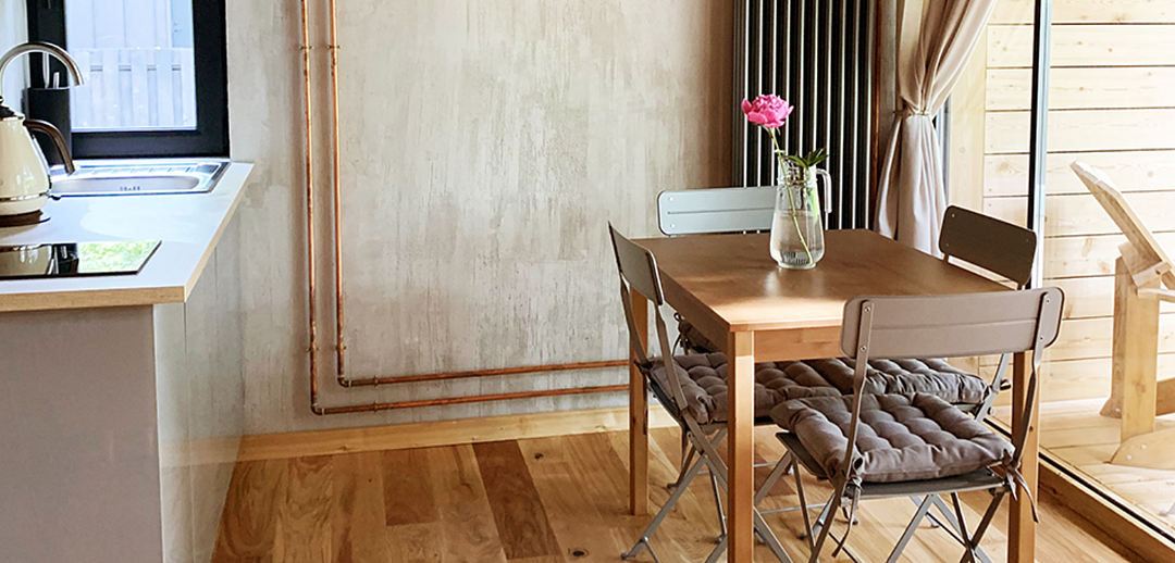 Отличительной чертой глэмпинга является его минимализм, простота и экологичность. В интерьере использованы эксклюзивные материалы: натуральная паркетная доска, отопление медными трубами, отделка стен лиственницей, итальянские дизайнерские радиаторы, проводка в ретро стиле, панорамные окна из закалённого стекла и сантехнические приборы фирмы grohe.