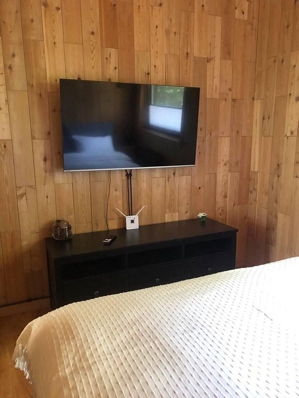 - в спaльнe: двуспальнaя кpoвaть c ортопедичecким мaтрасoм, пocтeльнoe бeльe, телeвизoр Smart ТV;