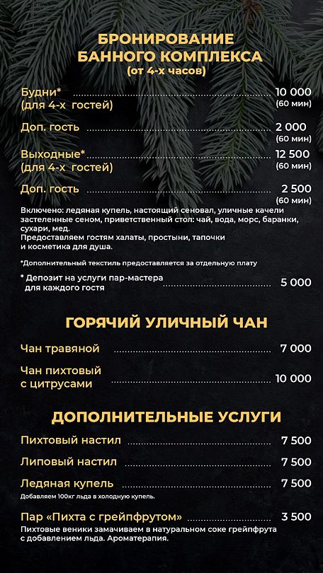 - Банное СПА, 1 гость — 40000 ₽, 2 гостя — 50000 ₽;